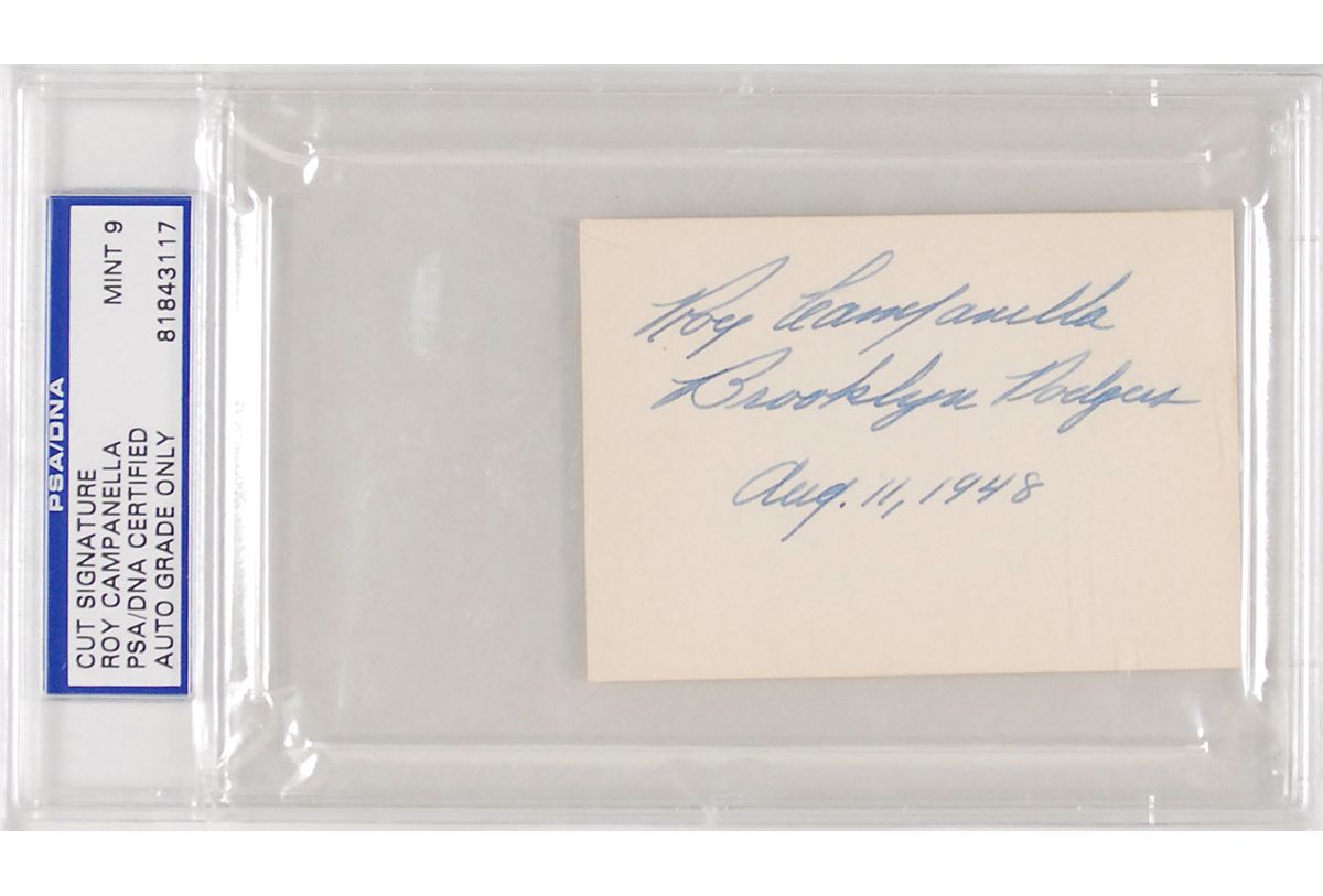 Ideal vintage fountain pen signature from his rookie year, “Roy Campanella, Brooklyn Dodgers, Aug. 11, 1948,” on an off-white 3.5 x 2.5 card. Encapsulated in a plastic PSA/DNA authentication holder, which grades the signature a ‘9.’ In very fine condition.