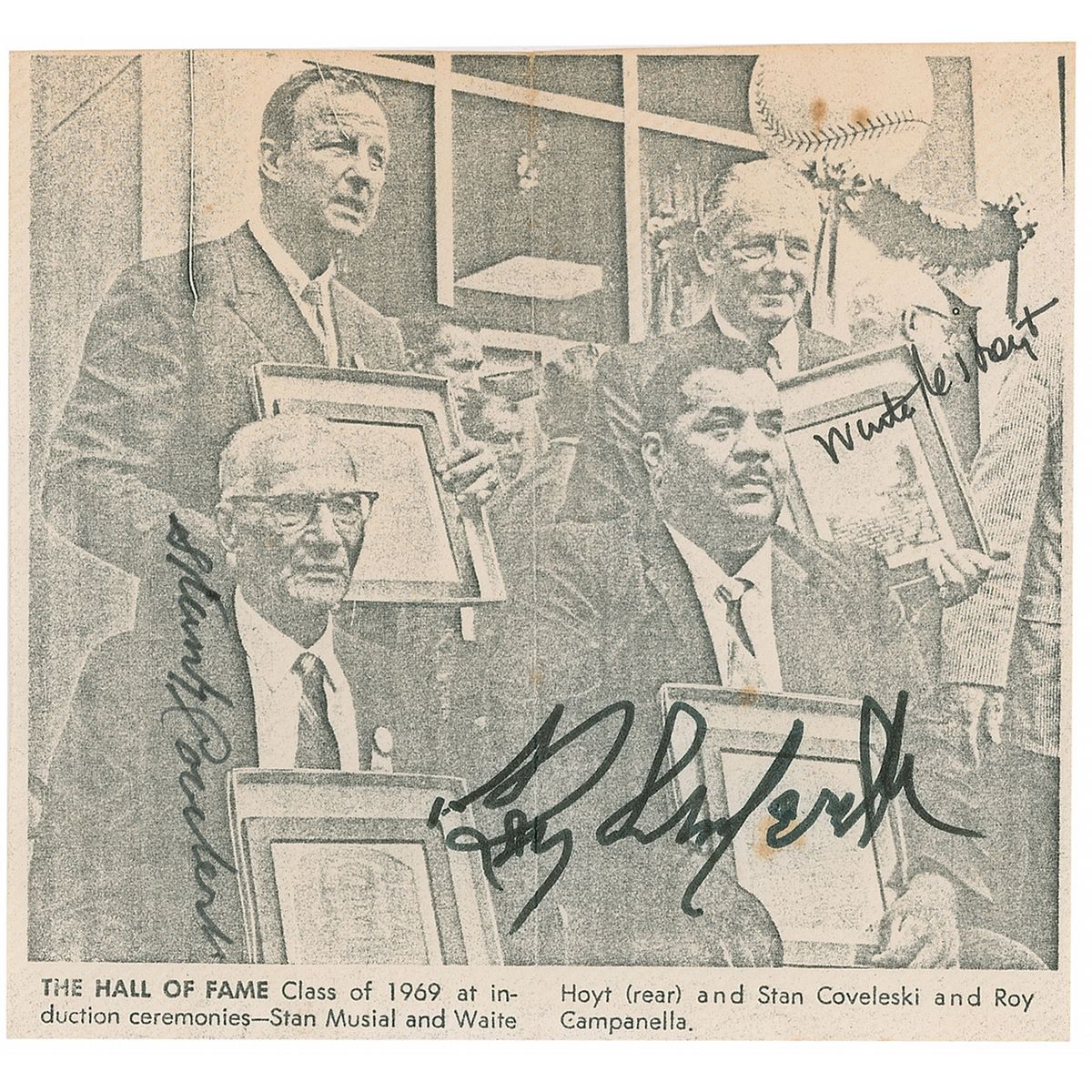 Uncommon 6.25 x 5.75 paperstock photocopied newspaper photo of the Hall of Fame class of 1969, signed in black felt tip by Roy Campanella, Waite Hoyt, and Stan Coveleski. In very good condition, with a central vertical fold passing through a single letter of Campanella’s signature, a low-quality grainy image, and a couple stains to the upper right. Authentic Campanella autographs from this period of his life are uncommon due to the physical limitations following his car accident, making signed items related to his induction into the Hall of Fame quite scarce.