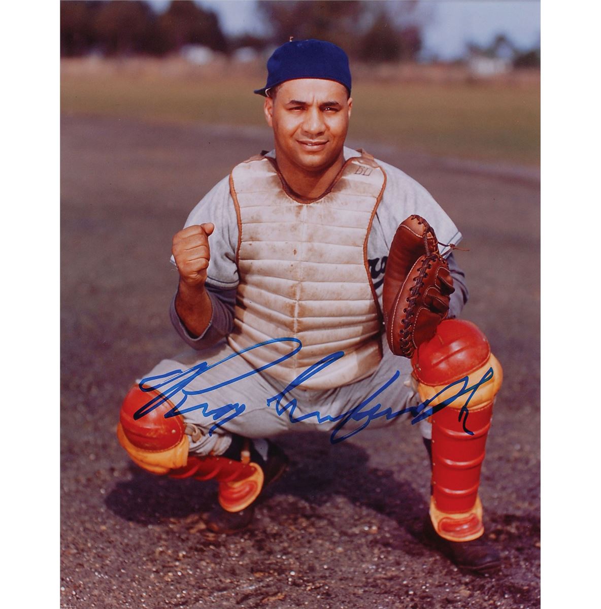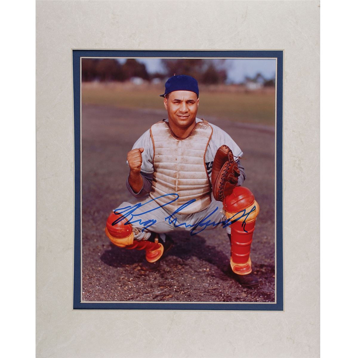 Color glossy 7.5 x 9.5 photo of Campanella in his catcher’s stance, signed in blue felt tip. Double-matted to an overall size of 11 x 14. In fine condition.