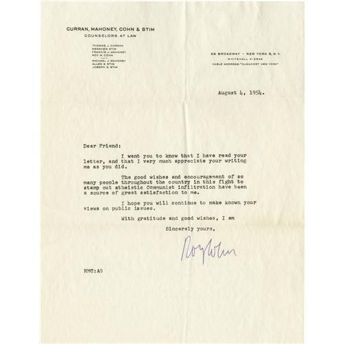 <B>Roy Cohn Signed Letter.</B></I> A single-page, typed letter dated August 4, 1954, signed by notorious attorney Roy Cohn in blue ink. In it he states: "The good wishes and encouragement of so many people throughout the country in this fight to stamp out atheistic Communist infiltration have been a source of great satisfaction to me." The letter is on Cohn's New York law firm letterhead and is in Very Fine to Excellent condition with some mailing creases. <I>Accompanied by a certificates of authenticity.</B></I><BR><BR><b>Shipping:</b> Small Flat (<a target="_blank" href="http://www.heritageauctions.com/common/shipping.php">view shipping information</a>) <BR><BR><B>Important no