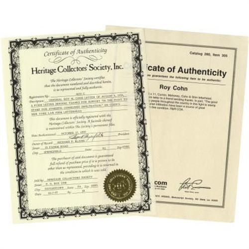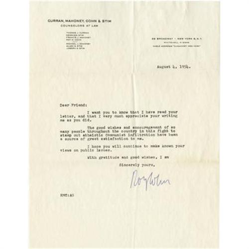 <B>Roy Cohn Signed Letter.</B></I> A single-page, typed letter dated August 4, 1954, signed by notorious attorney Roy Cohn in blue ink. In it he states: "The good wishes and encouragement of so many people throughout the country in this fight to stamp out atheistic Communist infiltration have been a source of great satisfaction to me." The letter is on Cohn's New York law firm letterhead and is in Very Fine to Excellent condition with some mailing creases. <I>Accompanied by a certificates of authenticity.</B></I><BR><BR><b>Shipping:</b> Small Flat (<a target="_blank" href="http://www.heritageauctions.com/common/shipping.php">view shipping information</a>)
