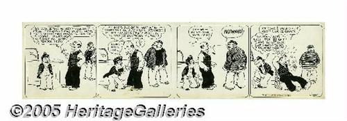 <B>Roy Crane - Wash Tubbs Daily Comic Strip Original Art, 7-7-24 (N.E.A. Syndicate, 1924).</B></I> "Worms ain't noted fer their beauty yet they ain't ferocious". Wash Tubbs' boss spouts off about the fact that "tough guys" might look ugly, but they're really harmless, when a hulking malcontent shoves his way into the scene, in this <I>Wash Tubbs</B></I> daily from July 7, 1924. Drawn within three months of the strip's first publication on April 21, 1924, this brilliantly staged, four-paneled strip features prime early Roy Crane art! The image area of this art is 24.5" x 6". There is some very light spotting at the bottom of the second panel, otherwise the art is in Excellent condition.