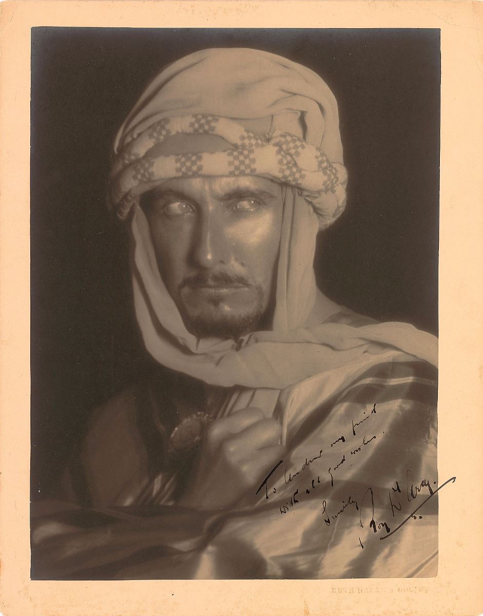 American film actor of the silent film and early sound period of the 1930s (1894–1968) best remembered for his portrayal of eccentric villains. Vintage matte-finish 11 x 14 photo of D’Arcy wearing a keffiyeh, signed and inscribed in fountain pen, “To Andrew my friend, with all good wishes, Roy D’Arcy.” Blindstamped in the lower right by the photographer, “Ruth Harriet Louise.” Reverse bears an MGM photography credit stamp. In fine condition.