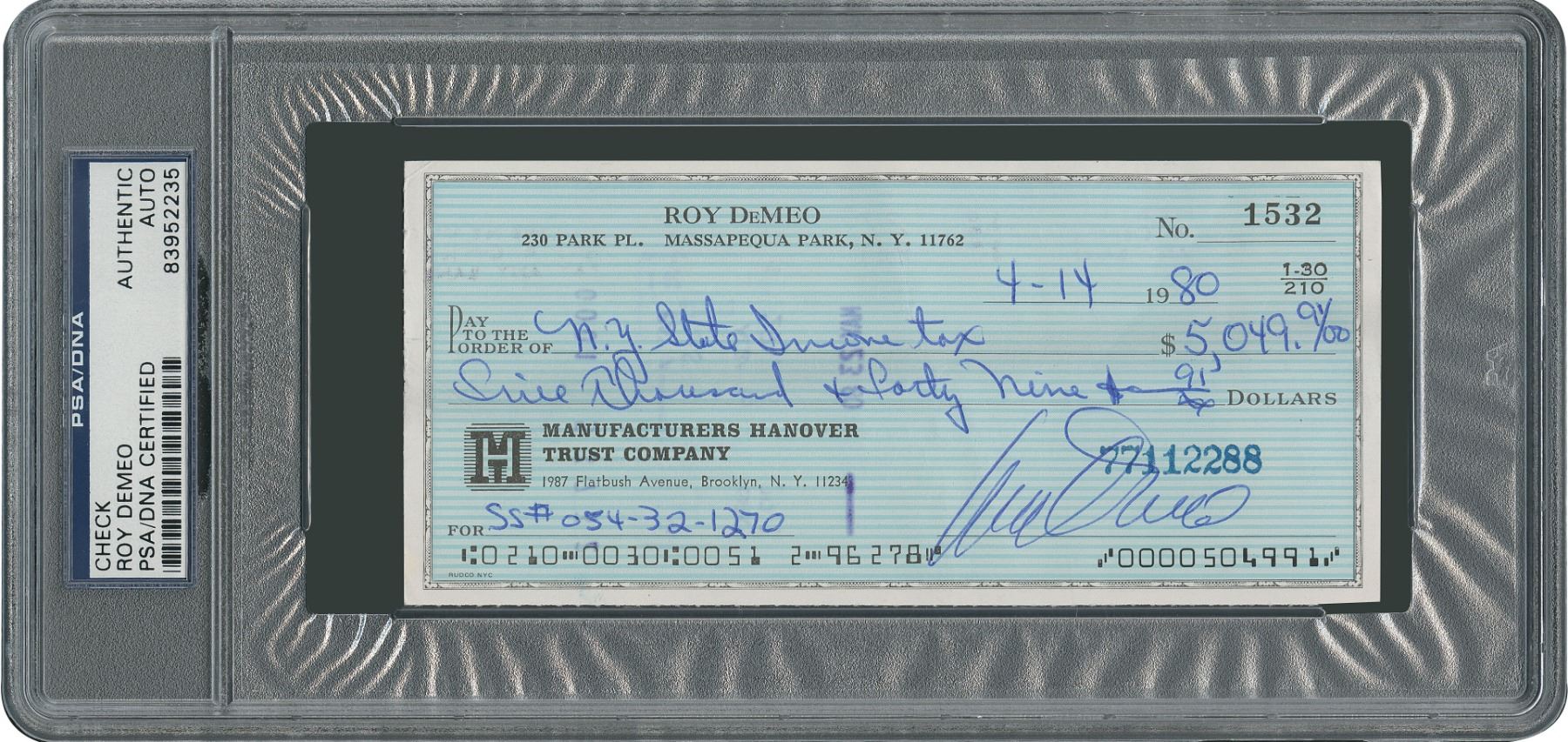 New York mobster and member of the Gambino crime family (1942-1983). Personal check, 6 x 2.75, filled out in another hand and signed by DeMeo, payable to New York State Income Tax for $5049.91, April 14, 1980. Encapsulated in a PSA/DNA authentication holder. In fine condition.
