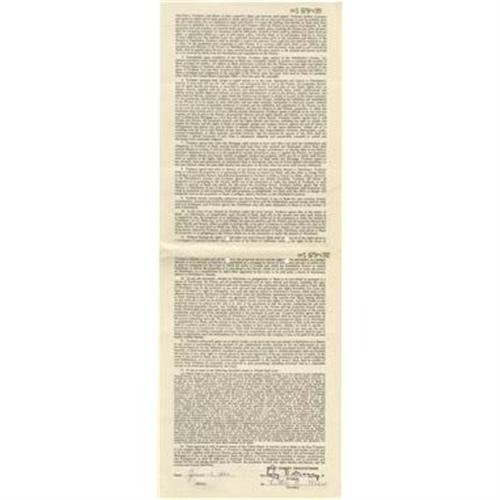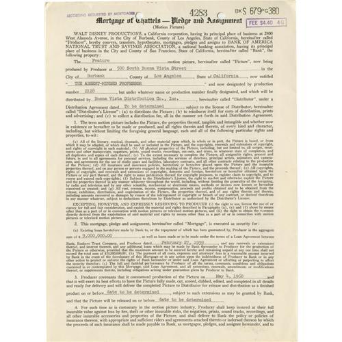 <B>Roy Disney Signed "Absent-Minded Professor" Mortgage.</B></I> Walt Disney Productions' original mortgage for <I>The Absent-Minded Professor</B></I> to the Bank of America, dated June 17, 1960, and signed by Roy Disney on the last page in black ink. An extremely rare document, in Very Fine condition with mild wear and tanning, and punch holes to the top edge. <I>Accompanied by LOA from PSA/DNA.</B></I><BR><BR><b>Shipping:</b> Small Flat (<a target="_blank" href="http://www.heritageauctions.com/common/shipping.php">view shipping information</a>)