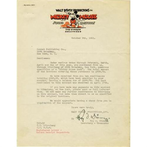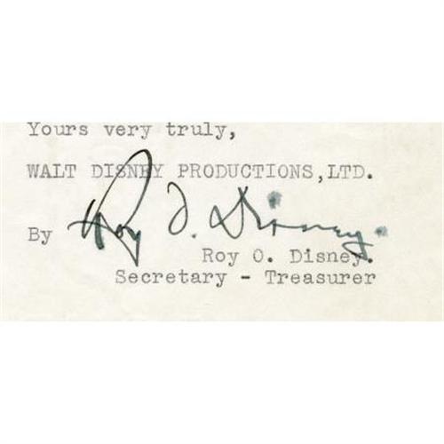 <B>Roy Disney Signed Letter.</B></I> A single-page letter on Walt Disney Productions stationery (featuring a nifty Mickey Mouse logo), dated October 9, 1931, and signed by Roy Disney in black ink. In Fine to Very Fine condition with mild overall toning, heavy mailing creases, soiling along the left edge, and some mild smearing to the signature. <I>Accompanied by LOA from PSA/DNA.</B></I><BR><BR><b>Shipping:</b> Flat Material, Small (<a target="_blank" href="http://www.heritageauctions.com/common/shipping.php">view shipping information</a>)