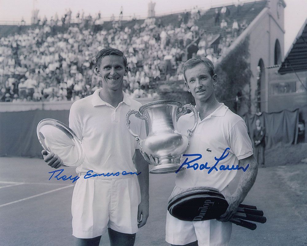 Glossy 10 x 8 photo of Laver and Emerson posing with their respective trophies after a tournament, signed in blue felt tip by both Emerson and Laver. In very fine condition.