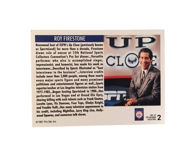 A Pro Set Football card autographed by sports reporter Roy Firestone ca. 1991. This card is from the National Collectible cards. (approx. 3 1/2 x 2 1/2 in. )