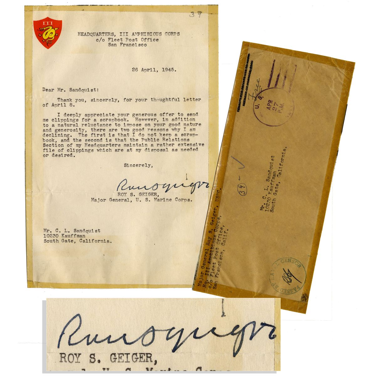 General Roy Geiger typed letter signed, dated 26 April 1945. Geiger writes from the Headquarters of the III Amphibious Corps, which he commanded during the Battle of Okinawa, the largest amphibious assault in the Pacific during World War II. He signs, ''Roy S Geiger'', thanking a Mr. Sandquist for offering to send news clippings. Tape residue to 6.25'' x 9.25'' single page letter and accompanying front panel of envelope with Naval Censor stamp. Very good.