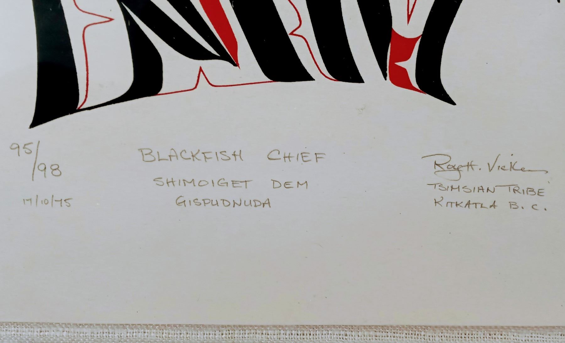 Roy H Vickers Silk Screen Art titled "Blackfish Chief" Shimoiget Dem Gispudnuda Signed Roy H Vickers Tsimsian Tribe Kitkatla B.C. # 93 of 98. Framed. 17 3/4" H x 14 3/4" W. In very good condition.