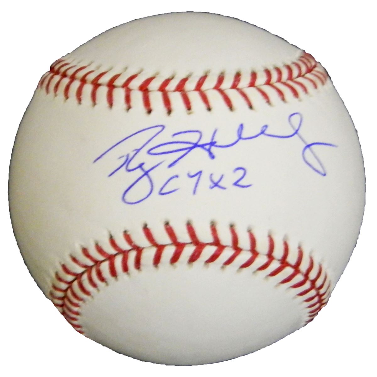 Roy Halladay signed Rawlings official MLB baseball with 'CY 2x' inscription. Item comes with a Schwartz Sports Memorabilia tamper-proof numbered hologram and Certificate of Authenticity which can be verified online.