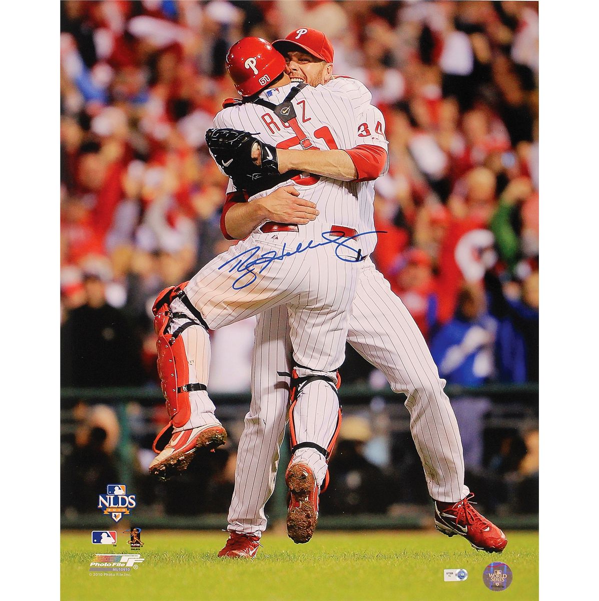 Color glossy 16 x 20 photo of Halladay after his no-hitter in the 2010 NLDS, signed in blue felt tip. In fine condition, with an MLB authentication label affixed to the lower right corner.