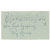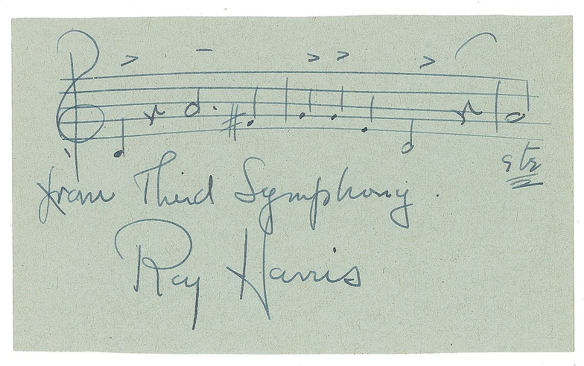 American composer (1898–1979) who wrote copiously on American subject and lore; his Symphony No. 3 joined the American repertoire during the same era as works by Aaron Copland and Virgil Thomson. AMQS on a light green 4.25 x 2.5 slip, signed at the bottom in ink by Harris, who pens two bars of music of his most famous piece, adding below, “from Third Symphony.” In fine condition.