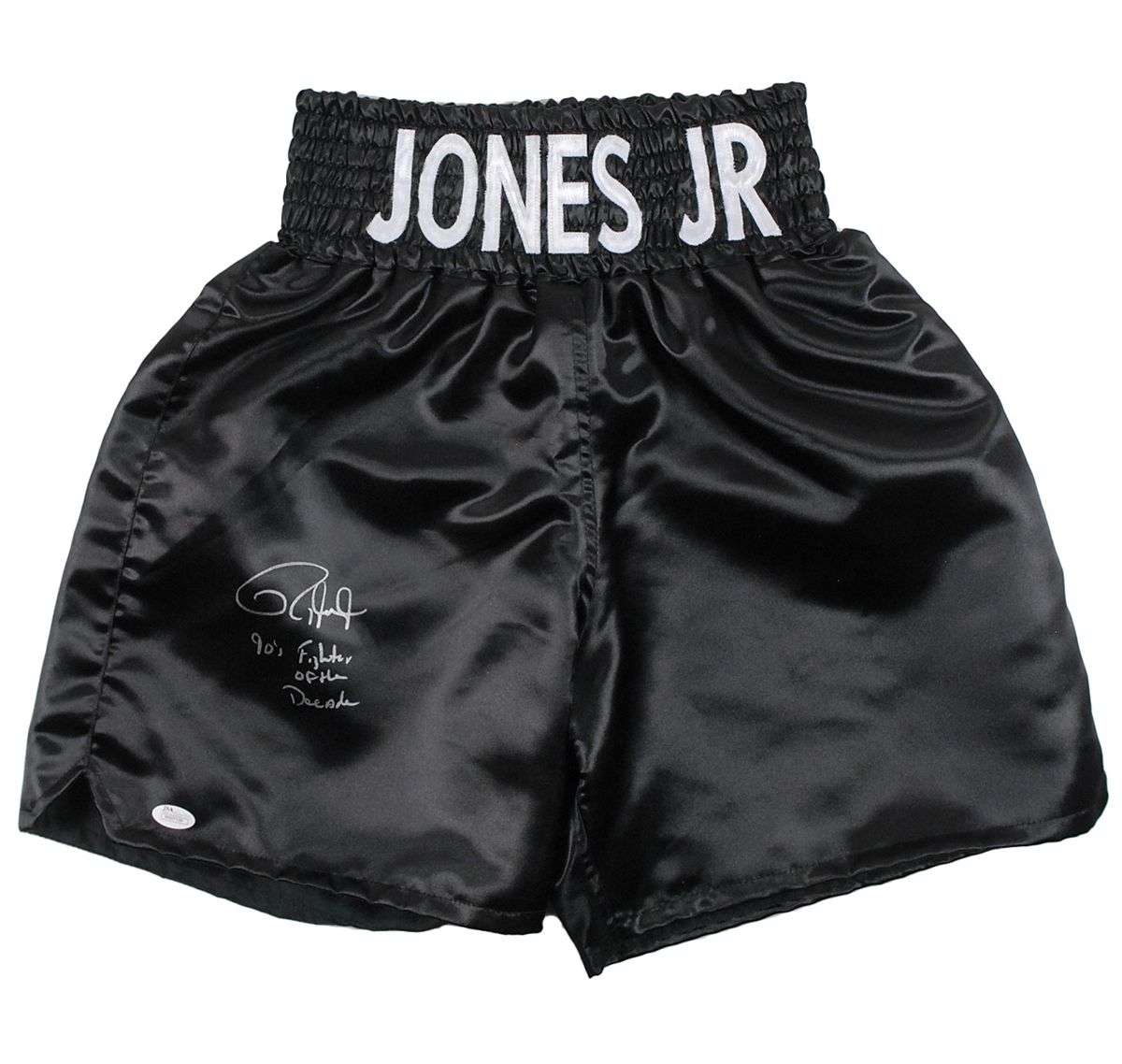 Black boxing trunks signed in silver ink on the front, “Roy Jones, Jr., 90’s Fighter of the Decade.” In fine condition, with a JSA label affixed to the front. Accompanied by a certificate of authenticity from JSA.