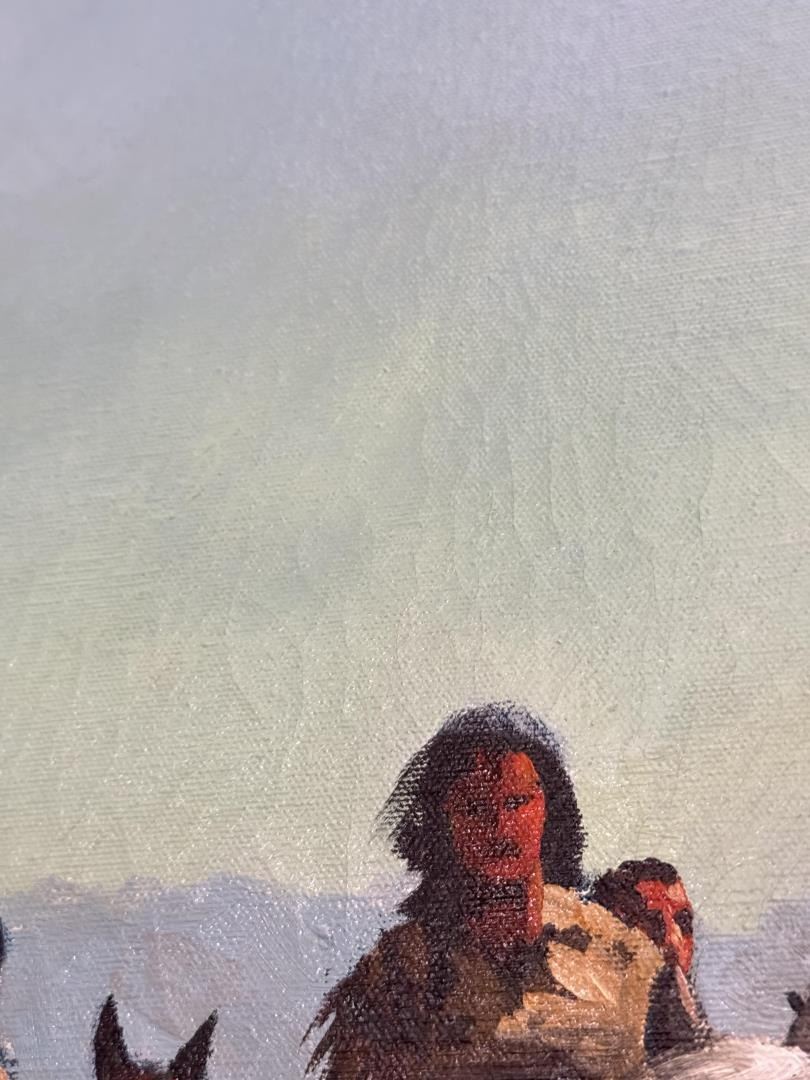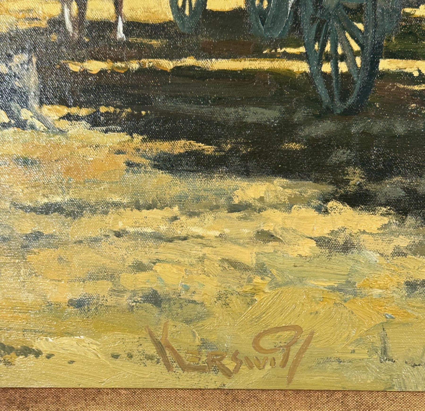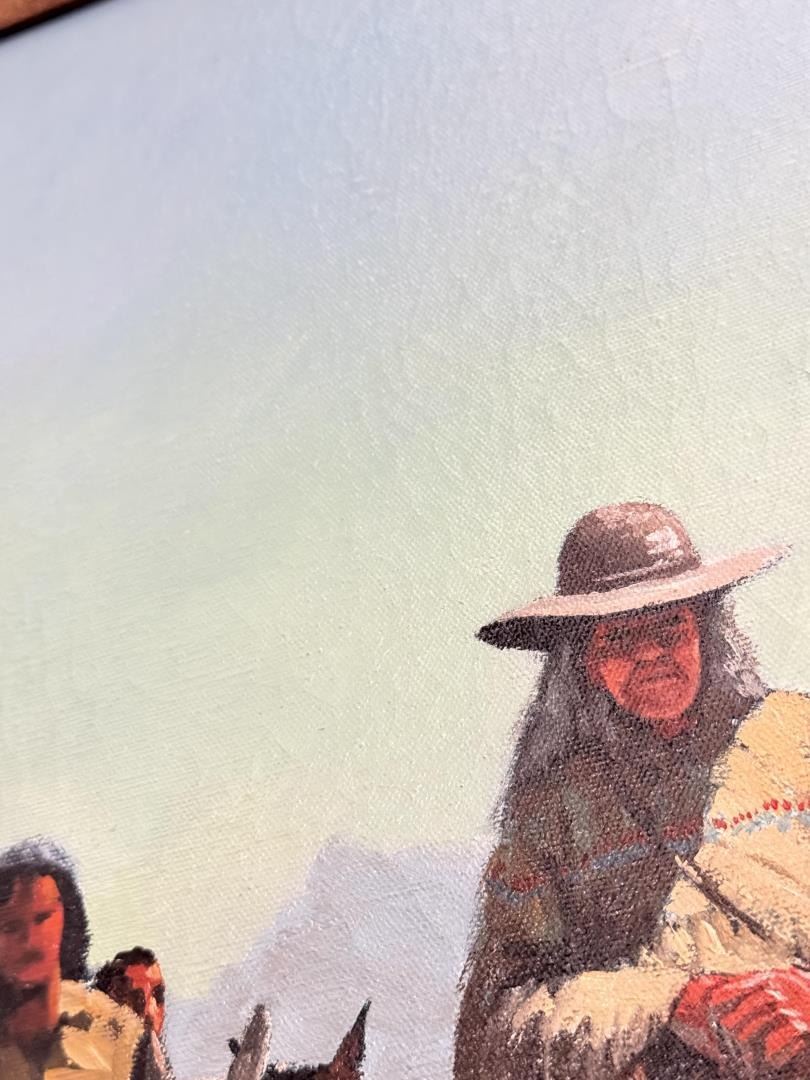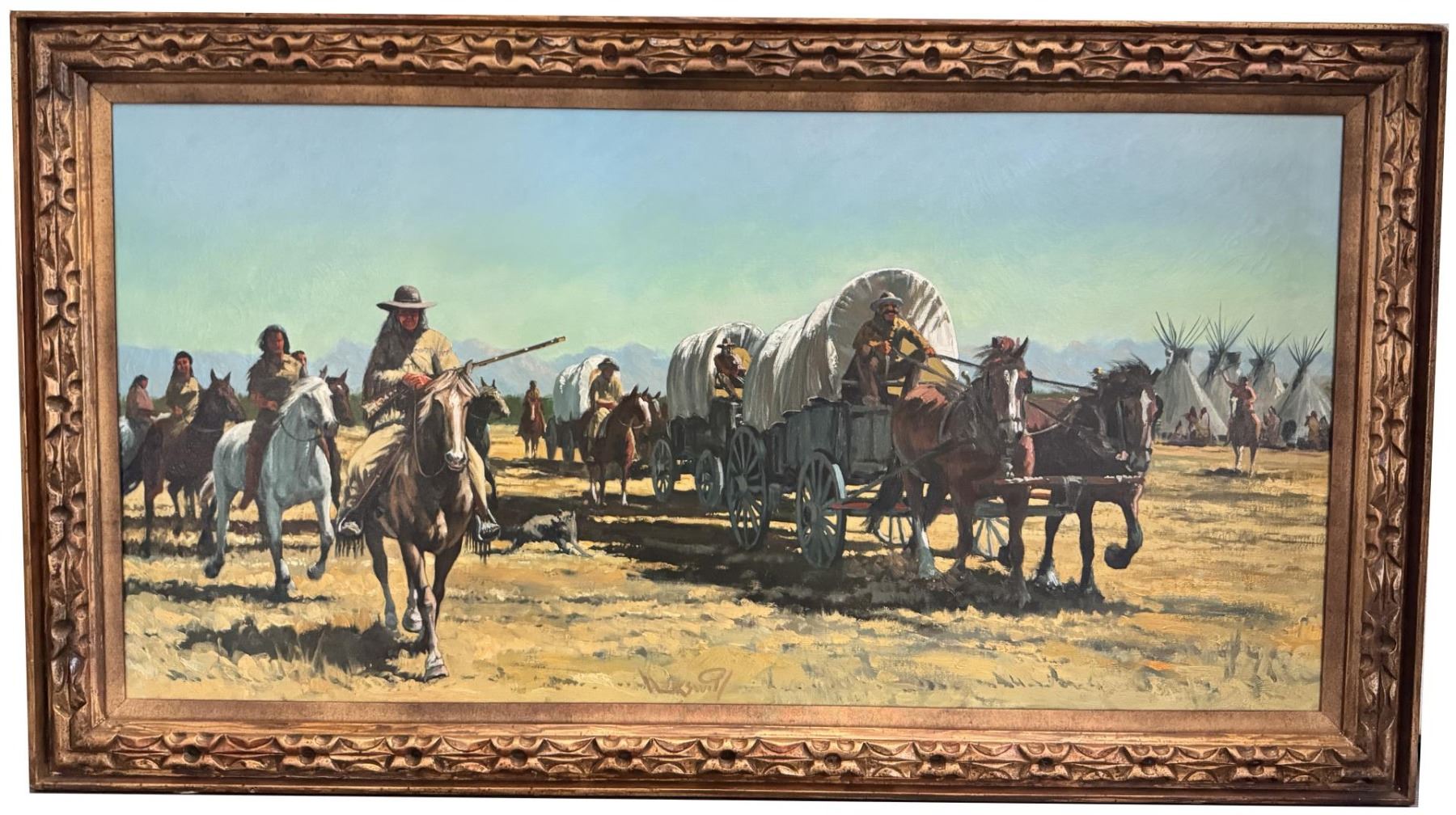 Title is Traders Passing Indian Camp. Oil on Canvas. 24" by 48" unframed. 30" by 54" framed. Some minor cracklure to canvas. Roy J W Kerswill (1925 - 2002) was active/lived in Wyoming, Montana. Roy Kerswill is known for Landscape and frontier narrative painting. Born in Devon, England, Roy was the eldest of four children. From an early age, his main interest was drawing and painting, which was recognized at an early age when he won a scholarship to the Bristol College of Art at age 11. Roy served three years in the Royal Navy's Fleet Air Arm and saw much of the world. To further his travel interests, Roy was one of a four-man party from the U.K. that traveled to Canada in 1948 to carry out a three year adventure of North America. In order to finance such travel, the four had to obtain casual employment along the way. Two of the foursome secured such financially rewarding employment that they made the decision to leave the party. Roy and Monty Alford, the latter a surveyor, continued their original objectives, reaching the Yukon and Alaska. It was during the second year, while surveying in the Yukon, that they made plans for the third and final year of their travels. This was a journey through the United States. Their diagonal crossing of the U.S., from northwest to southeast, was made by water because it was by canoe that North America was first explored, mostly by those in the employ of the Hudson's Bay Company and the Northwest Company in search of furs for the markets in England and Europe. They purchased an 18 foot canvas covered, cedar canoe, and on the 16th of March, 1950, put in on the upper reaches of the Columbia River where Roy served as bowman. They traveled the Columbia River across the U.S. border, down to Pasco, Washington, where they turned up the roaring Snake River towards Jackson Hole, Wyoming. Navigation of the Snake River was by far the most difficult part of their journey. It was a two month long fight against a wild river with rapid after rapid to negotiate. Historically speaking, it is most likely the only time the river had been navigated by a powered canoe against its fast and turbulent current. They pulled their canoe out of the water of the Snake at Idaho Falls and portaged across the Continental Divide using a 1930 Chevrolet to Casper, Wyoming, where they launched on to the North Platte River. It was in the course of that portage that they passed, or ran alongside such rivers as the Hoback and Clearwater. The river today would not be recognizable as the same one Roy and Monty navigated. They had to portage five hydropower dams compared with the 15 in existence today. They continued on to the Middle Loup, Loup, South Platte, Platte, Missouri, and finally on to the giant Mississippi, finishing up at Baton Rouge with a final destination in New Orleans. Their journey was not only documented in many newspapers along the way, but Monty also submitted articles that were published back home in England. As a result of the publicity, they found themselves being greeted and welcomed into many towns and homes along the way. Their journey took exactly eight months, terminating on November 16, 1950. It was during this journey that Roy became acutely aware of the experiences of the Pioneers, moving him deeply and subsequently becoming the subject of many of his paintings. The book he authored and illustrated, A Pictorial Story of the Oregon-California Trail was published in 1996, and was made possible by Harry Cornell, Chairman and CEO of Leggett & Platt, and his wife, Ann. The book is the result of research done over a span of six years, after traveling the entire Oregon-California Trail with his wife, Betty. Roy worked in both oil and watercolor mediums. Some of his first professional work was as a freelance commercial artist, and then as an advanced space concept artist for the Martin Marietta Corporation in Denver. He was best known for his paintings of the Tetons and Historical scenes depicting the settling of the West to include Native American Indians, Mountain Men and/or Pioneers. He also painted the many areas he resided in: Colorado, Arizona, California, New York, Montana, and Europe. He loved to write poetry, and tried his hand at sculpting with his one bronze titled Early Warning System. Roy participated in many art shows throughout his career, and was one of a handful of artists to be invited each year to the Wyoming Governor's Invitational Art Show, held at the Cheyenne Frontier Days - Old West Museum since its inception in 1981.