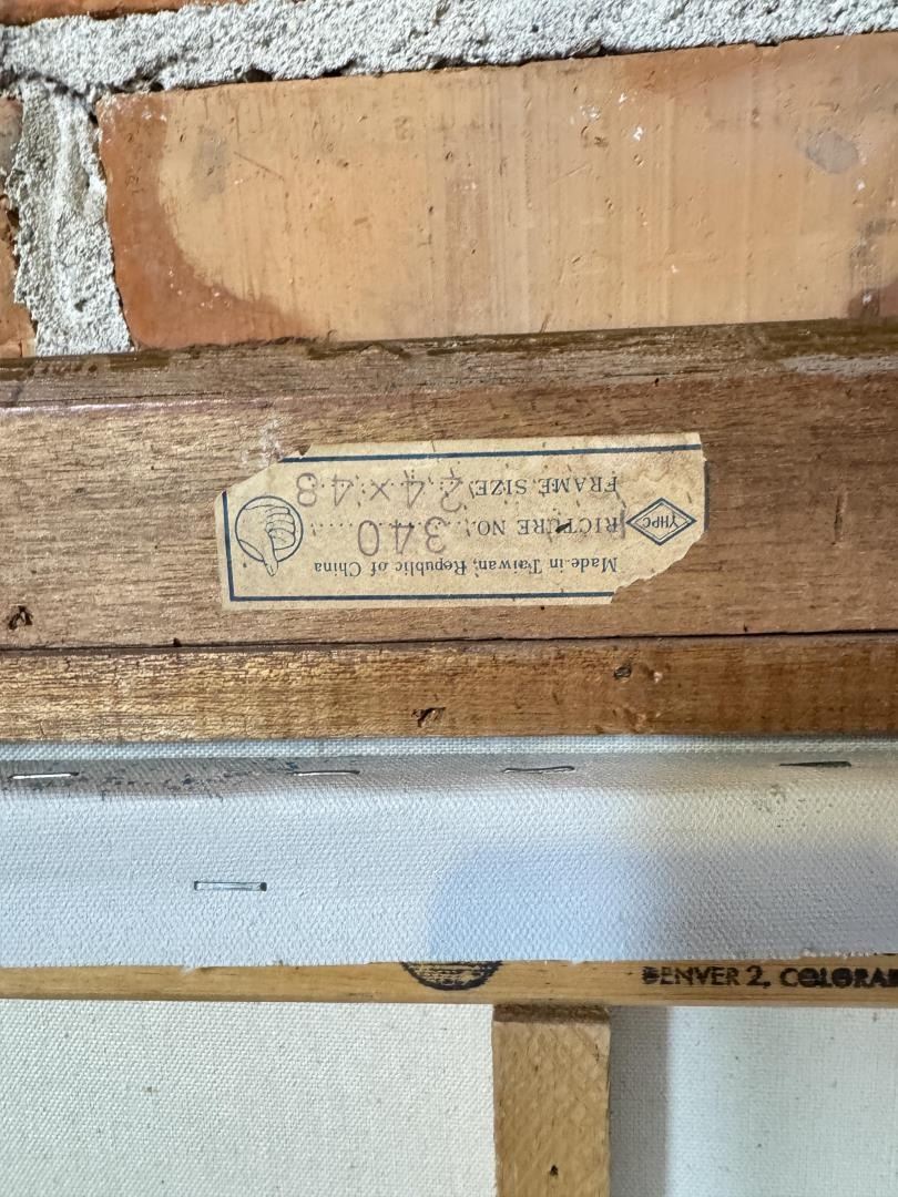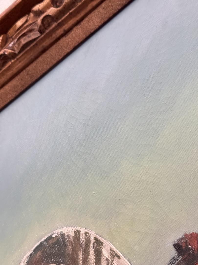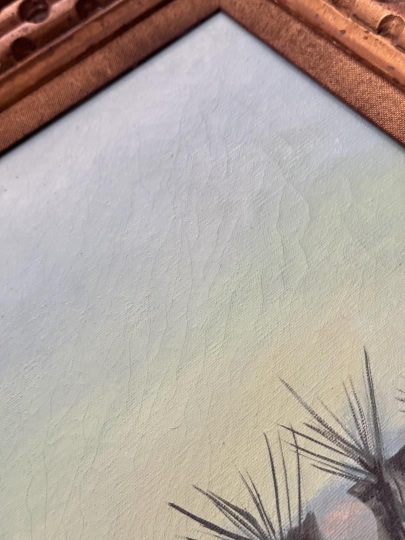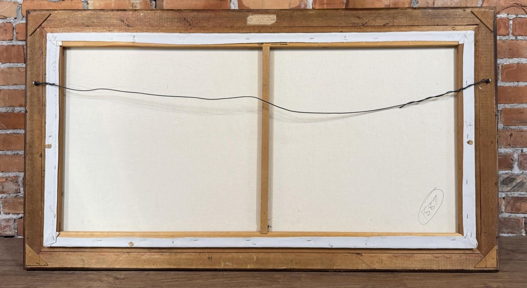 Title is Traders Passing Indian Camp. Oil on Canvas. 24" by 48" unframed. 30" by 54" framed. Some minor cracklure to canvas. Roy J W Kerswill (1925 - 2002) was active/lived in Wyoming, Montana. Roy Kerswill is known for Landscape and frontier narrative painting. Born in Devon, England, Roy was the eldest of four children. From an early age, his main interest was drawing and painting, which was recognized at an early age when he won a scholarship to the Bristol College of Art at age 11. Roy served three years in the Royal Navy's Fleet Air Arm and saw much of the world. To further his travel interests, Roy was one of a four-man party from the U.K. that traveled to Canada in 1948 to carry out a three year adventure of North America. In order to finance such travel, the four had to obtain casual employment along the way. Two of the foursome secured such financially rewarding employment that they made the decision to leave the party. Roy and Monty Alford, the latter a surveyor, continued their original objectives, reaching the Yukon and Alaska. It was during the second year, while surveying in the Yukon, that they made plans for the third and final year of their travels. This was a journey through the United States. Their diagonal crossing of the U.S., from northwest to southeast, was made by water because it was by canoe that North America was first explored, mostly by those in the employ of the Hudson's Bay Company and the Northwest Company in search of furs for the markets in England and Europe. They purchased an 18 foot canvas covered, cedar canoe, and on the 16th of March, 1950, put in on the upper reaches of the Columbia River where Roy served as bowman. They traveled the Columbia River across the U.S. border, down to Pasco, Washington, where they turned up the roaring Snake River towards Jackson Hole, Wyoming. Navigation of the Snake River was by far the most difficult part of their journey. It was a two month long fight against a wild river with rapid after rapid to negotiate. Historically speaking, it is most likely the only time the river had been navigated by a powered canoe against its fast and turbulent current. They pulled their canoe out of the water of the Snake at Idaho Falls and portaged across the Continental Divide using a 1930 Chevrolet to Casper, Wyoming, where they launched on to the North Platte River. It was in the course of that portage that they passed, or ran alongside such rivers as the Hoback and Clearwater. The river today would not be recognizable as the same one Roy and Monty navigated. They had to portage five hydropower dams compared with the 15 in existence today. They continued on to the Middle Loup, Loup, South Platte, Platte, Missouri, and finally on to the giant Mississippi, finishing up at Baton Rouge with a final destination in New Orleans. Their journey was not only documented in many newspapers along the way, but Monty also submitted articles that were published back home in England. As a result of the publicity, they found themselves being greeted and welcomed into many towns and homes along the way. Their journey took exactly eight months, terminating on November 16, 1950. It was during this journey that Roy became acutely aware of the experiences of the Pioneers, moving him deeply and subsequently becoming the subject of many of his paintings. The book he authored and illustrated, A Pictorial Story of the Oregon-California Trail was published in 1996, and was made possible by Harry Cornell, Chairman and CEO of Leggett & Platt, and his wife, Ann. The book is the result of research done over a span of six years, after traveling the entire Oregon-California Trail with his wife, Betty. Roy worked in both oil and watercolor mediums. Some of his first professional work was as a freelance commercial artist, and then as an advanced space concept artist for the Martin Marietta Corporation in Denver. He was best known for his paintings of the Tetons and Historical scenes depicting the settling of the West to include Native American Indians, Mountain Men and/or Pioneers. He also painted the many areas he resided in: Colorado, Arizona, California, New York, Montana, and Europe. He loved to write poetry, and tried his hand at sculpting with his one bronze titled Early Warning System. Roy participated in many art shows throughout his career, and was one of a handful of artists to be invited each year to the Wyoming Governor's Invitational Art Show, held at the Cheyenne Frontier Days - Old West Museum since its inception in 1981.