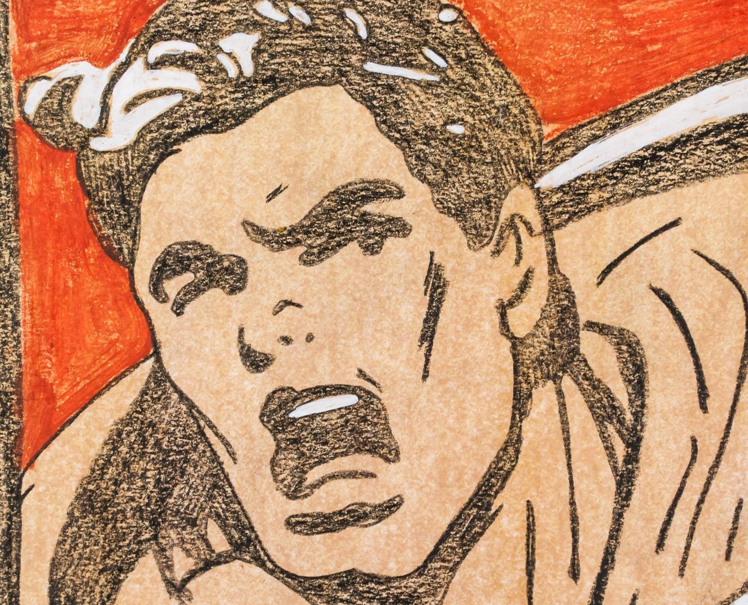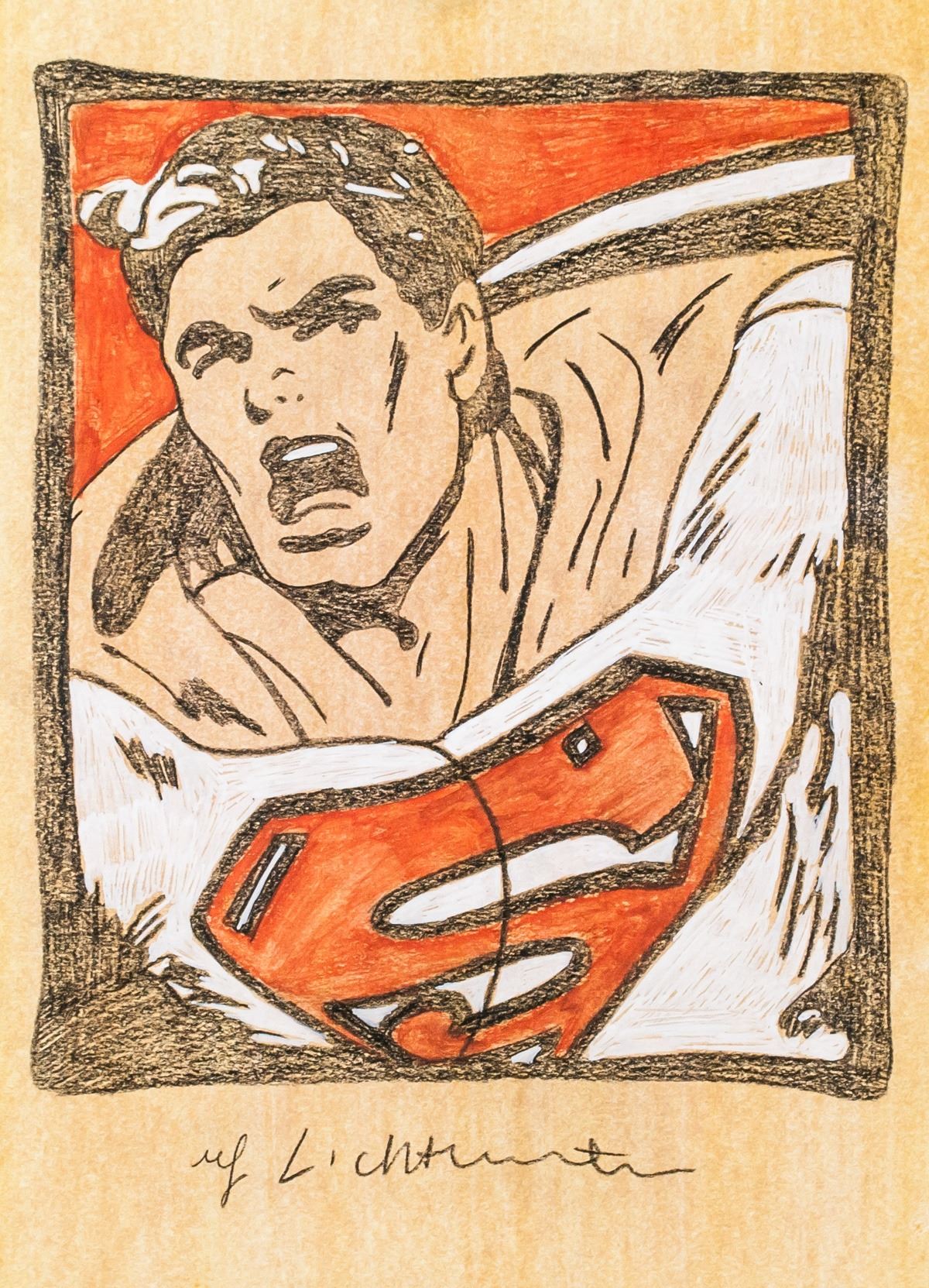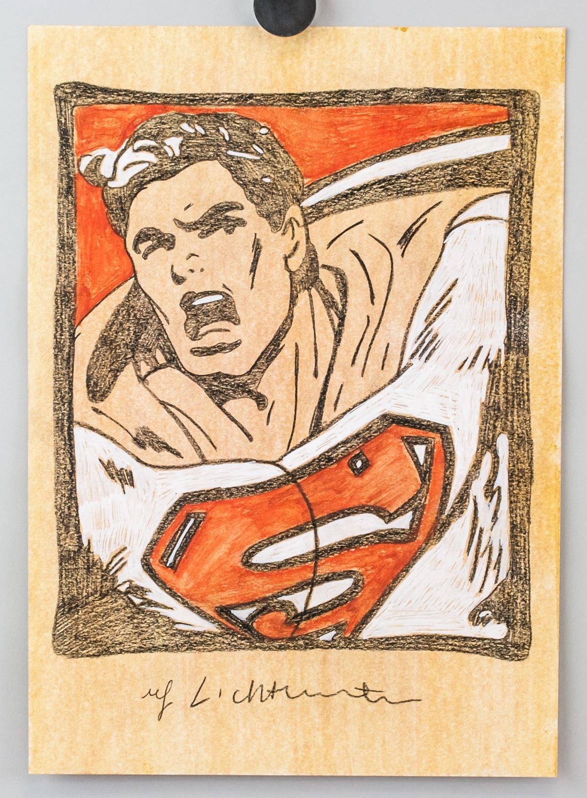 Mixed media on paper. Featuring portrait of Superman. Signed Roy Lichtenstein on the lower edge. Attributed to Roy Lichtenstein 1923-1997, American). 30 x 21 cm (11.75 x 8.25 inches). PROVENANCE: This lot carries limited provenance from a Southern Ontario estate