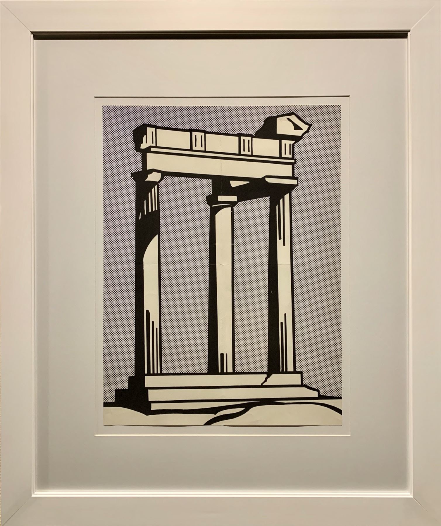 Roy Lichtenstein (1923-1997) "Temple" offset color lithograph, 1964. Sheet 22 7/8 x17 in, framed 37 1/4 x 31 1/4 inches. Published by Leo Castelli Gallery, New York. Soft vertical and horizontal folds. A very good impression. Rare limited edition produced to announce Lichtenstein's exhibition at Leo Castelli Gallery, New York, October 24-November 19, 1964. Corlett II. 3. Excellent condition, frame is new.