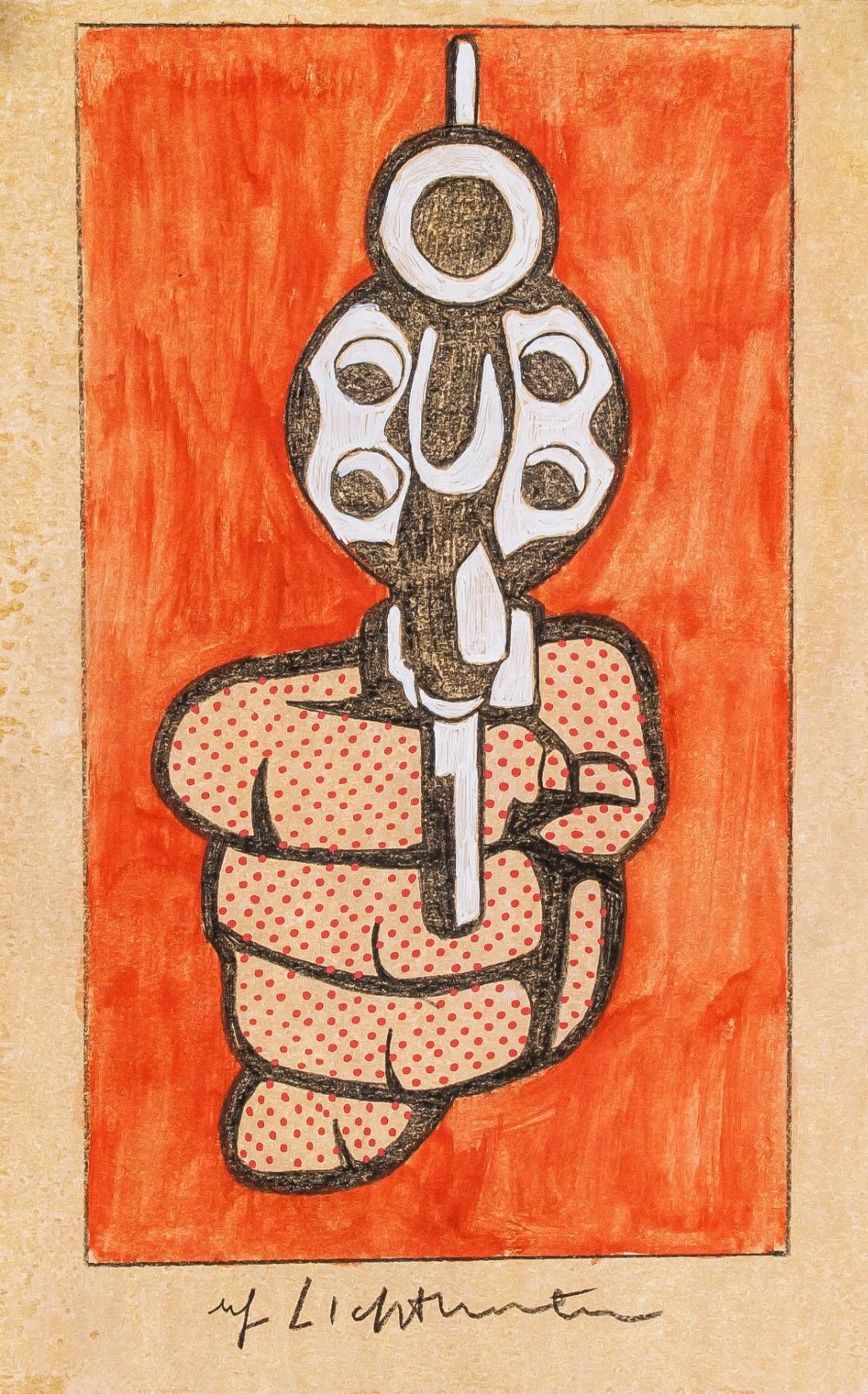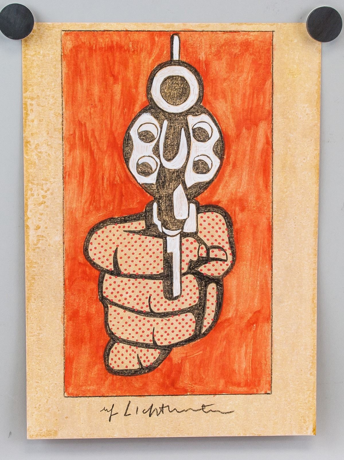 Mixed media on paper. Featuring a drawn gun pointed towards the viewer. Signed Roy Lichtenstein on the lower margin. Attributed to Roy Lichtenstein (1923-1997, American). 29.5 x 21 cm (11.6 x 8.3 inches). PROVENANCE: Upper New York estate