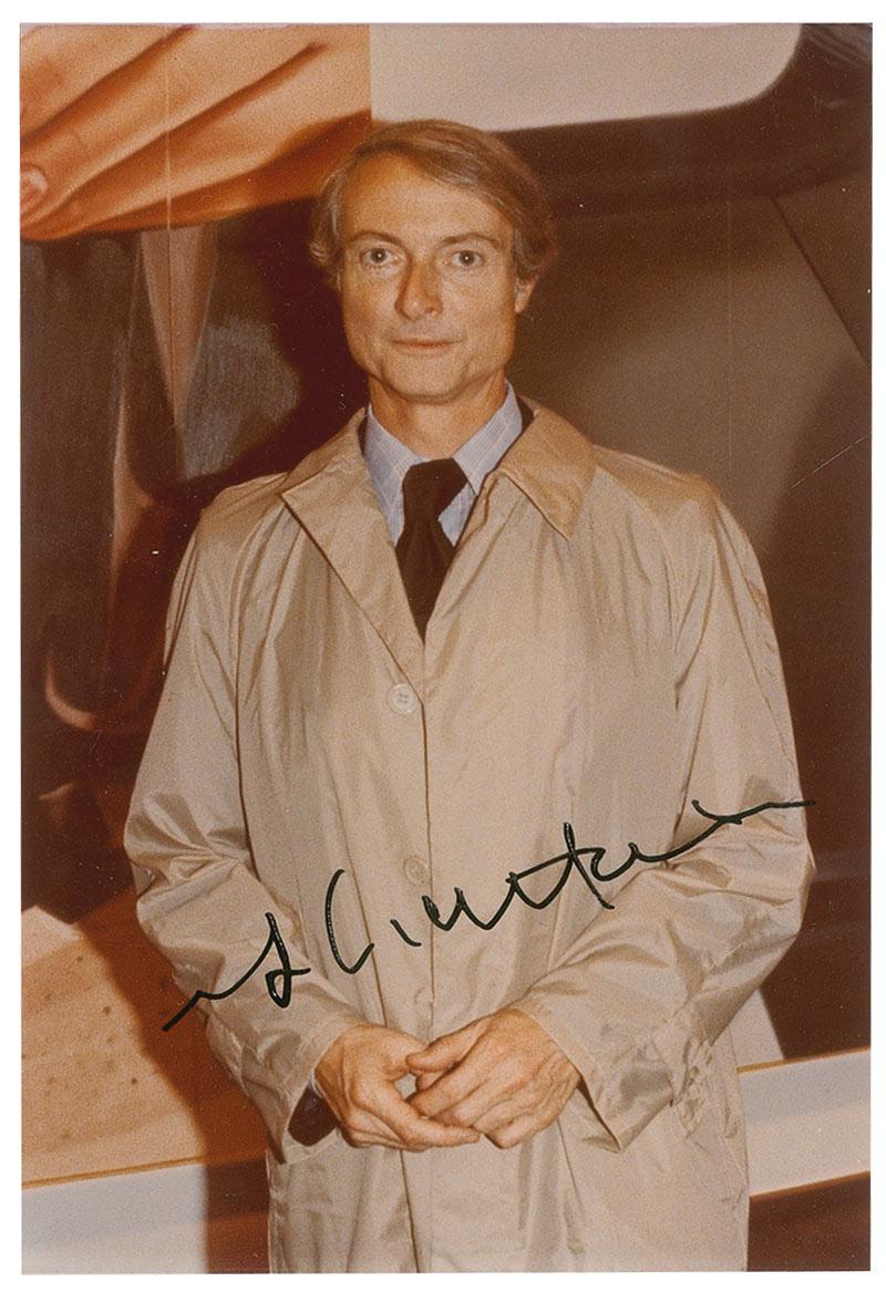 Color satin-finish 3.5 x 5 candid photo of the artist in an overcoat, signed in black felt tip. In fine condition.