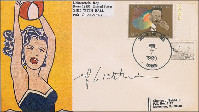 Postal cover with a small clipped portrait of Lichtenstein’s ‘Girl with Ball’ affixed, signed in ink by Lichtenstein. Postmarked July 7, 1989, in Boston. In fine condition with an identification label and address label affixed.