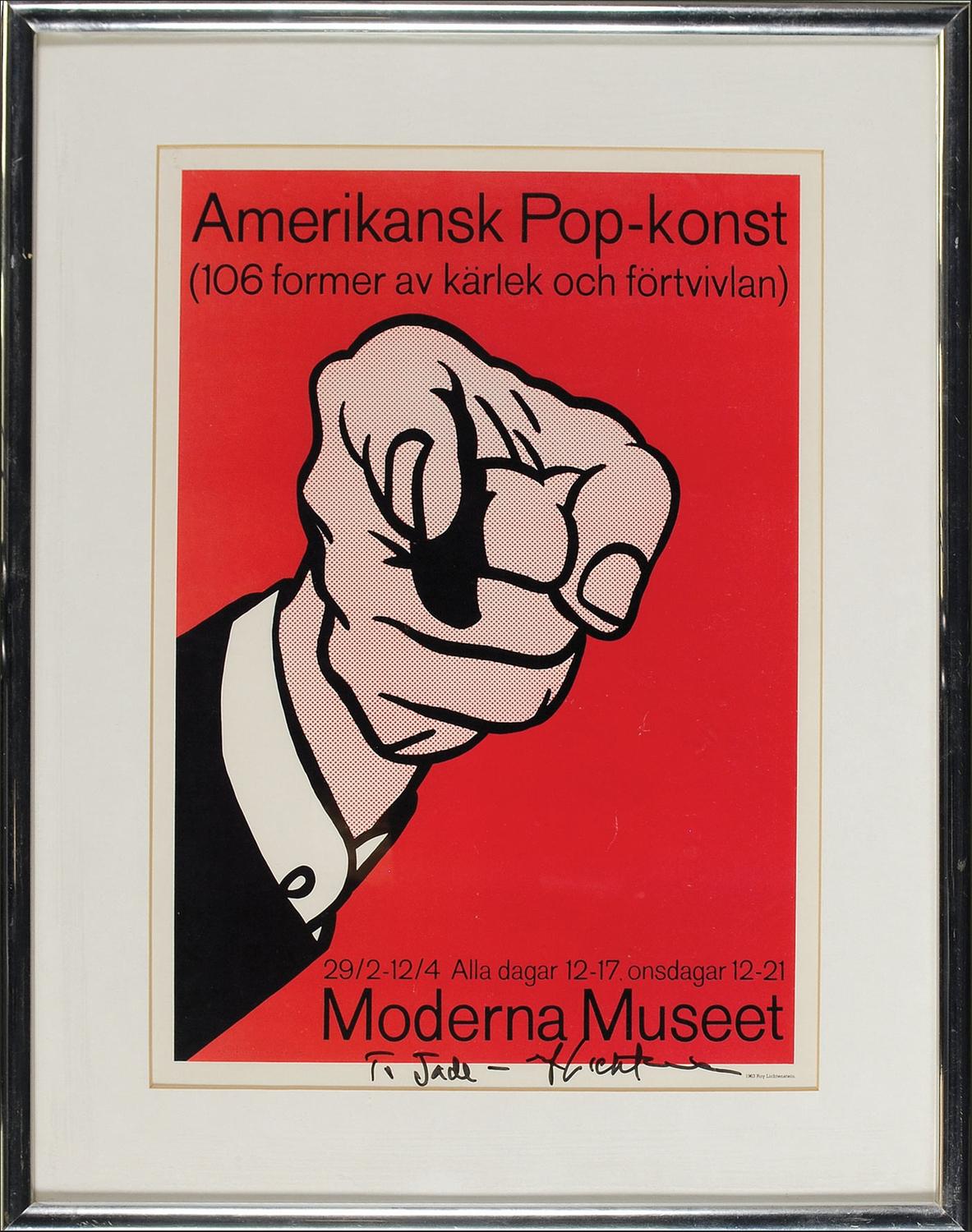 Color 11 x 16 print of the artist's iconic ‘Finger Pointing’ poster design for the seminal ‘Amerikansk Pop-konst’ exhibition at the Moderna Museet in Stockholm in 1964. Signed and inscribed along the bottom in black felt tip, “To Jade, Roy Lichtenstein.” Matted and framed to an overall size of 16.5 x 21. In fine condition, with a few scattered light creases and mild border toning.