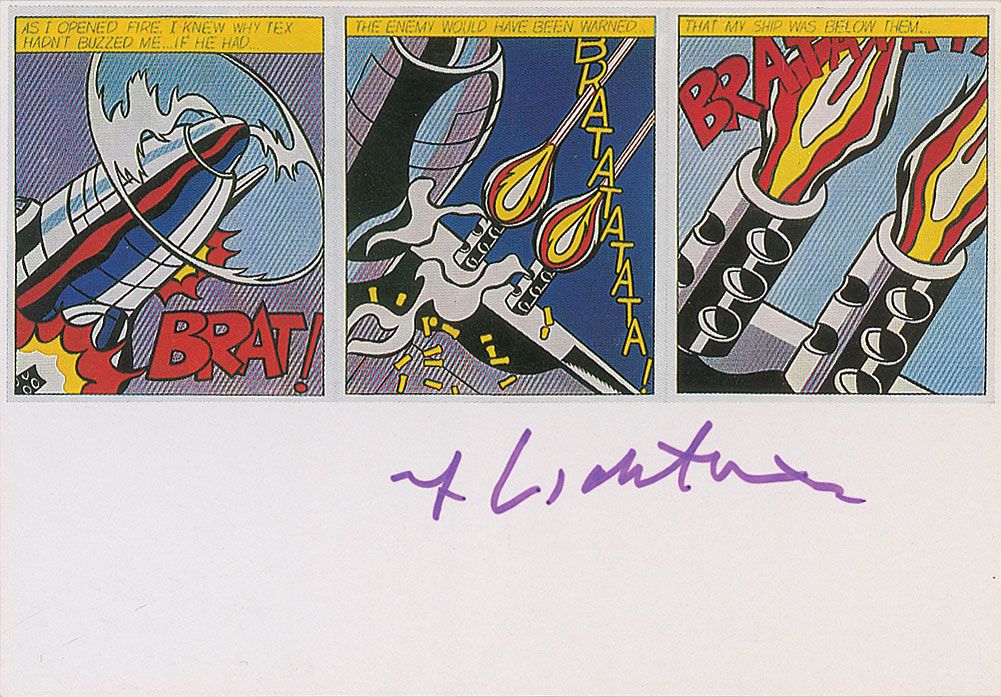 Color postcard of one of Lichtenstein’s works, 5.75 x 4, signed in the lower border in purple felt tip, “R. Lichtenstein.” In fine condition.