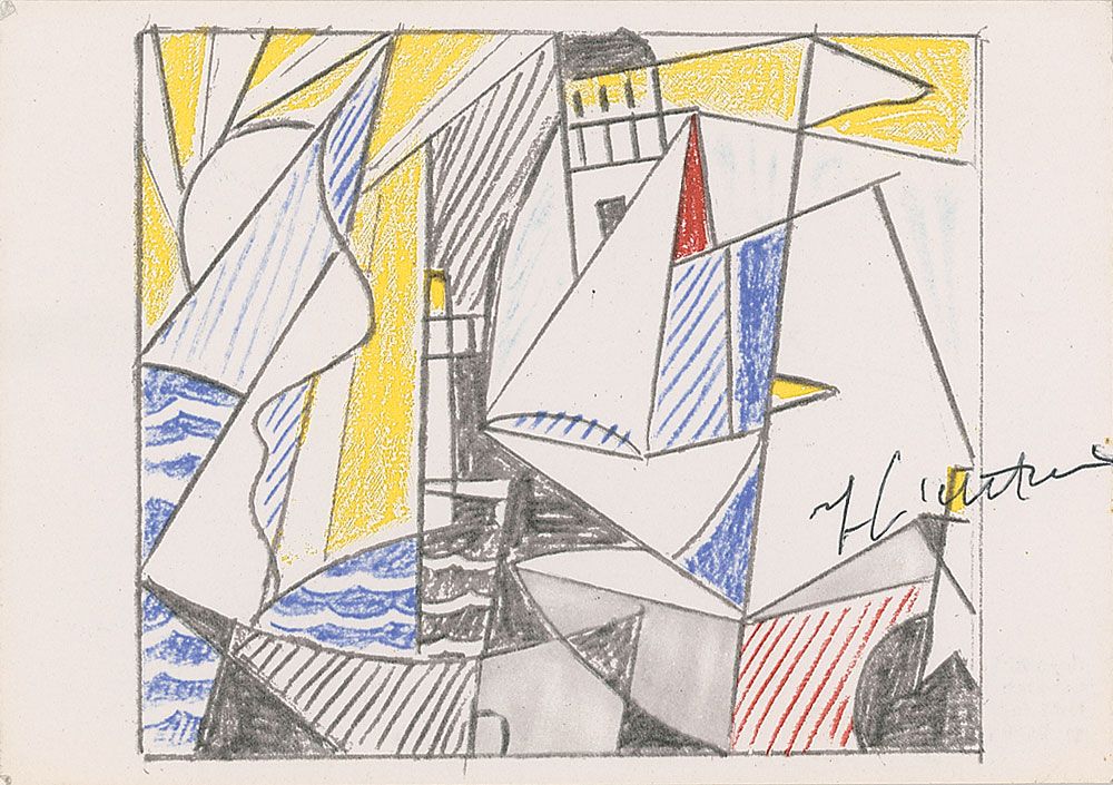 Color postcard of Lichtenstein’s 1974 work entitled ‘Sailboats,’ 5.75 x 4, signed on the right side in black ballpoint, “R. Lichtenstein.” In fine condition.