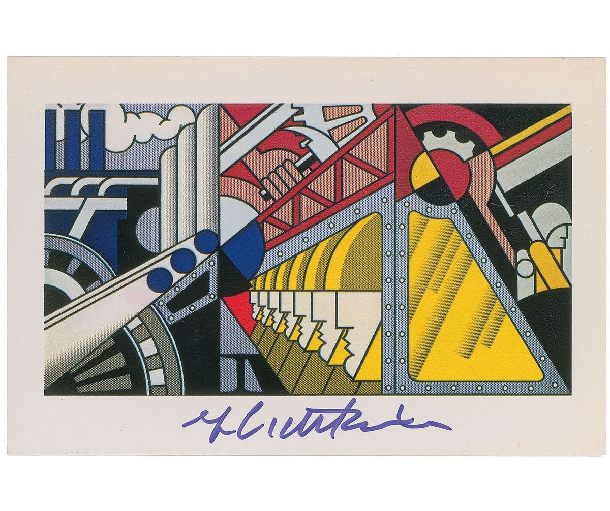 Color postcard of Lichtenstein’s 1968 work entitled ‘Preparedness,’ 6 x 4, signed in the lower border in blue felt tip. In fine condition.