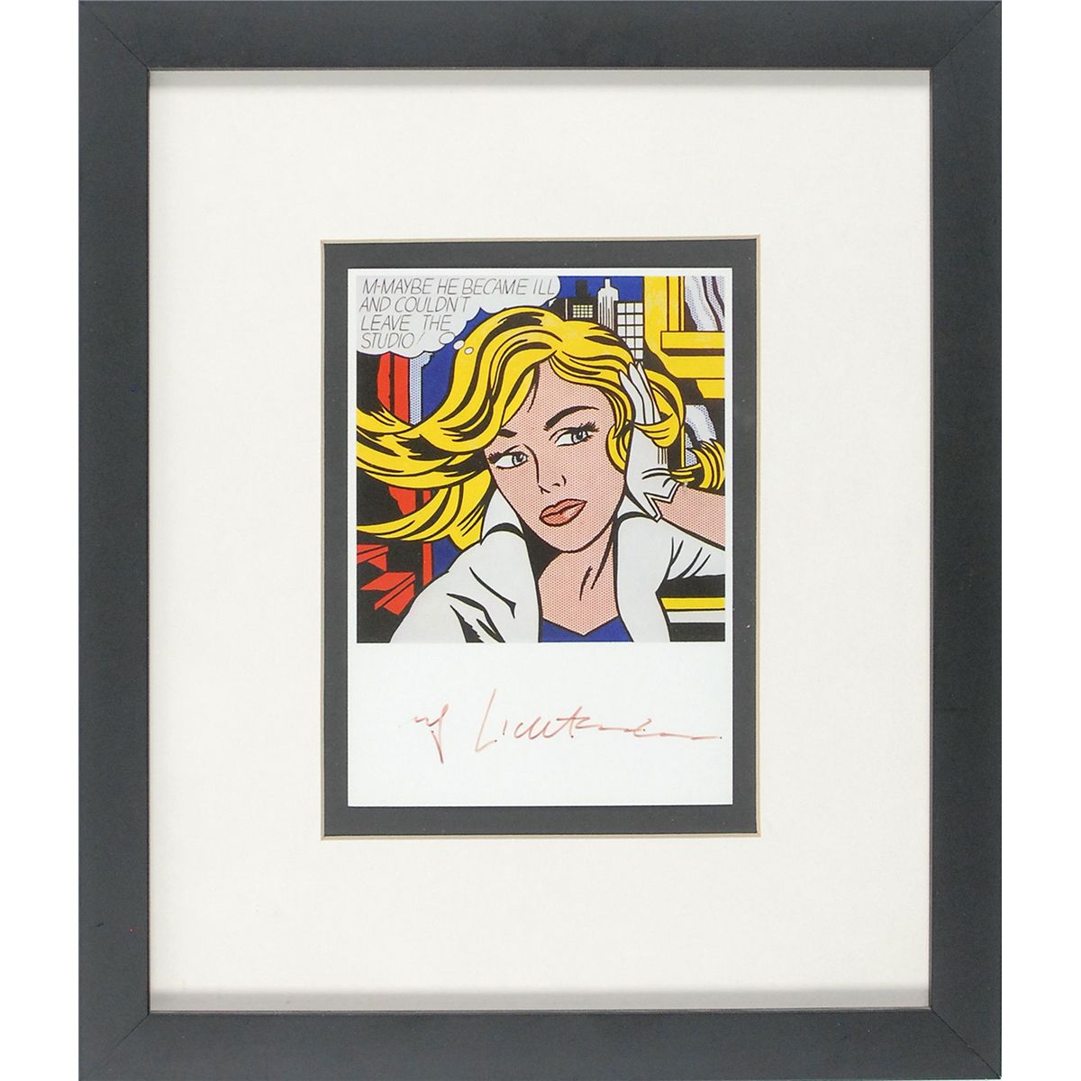 Color postcard of Lichtenstein’s 1965 work entitled ‘M-Maybe,’ 4 x 5.75, signed in the lower border in black felt tip. Matted and framed to an overall size of 10 x 11.75. In fine condition.