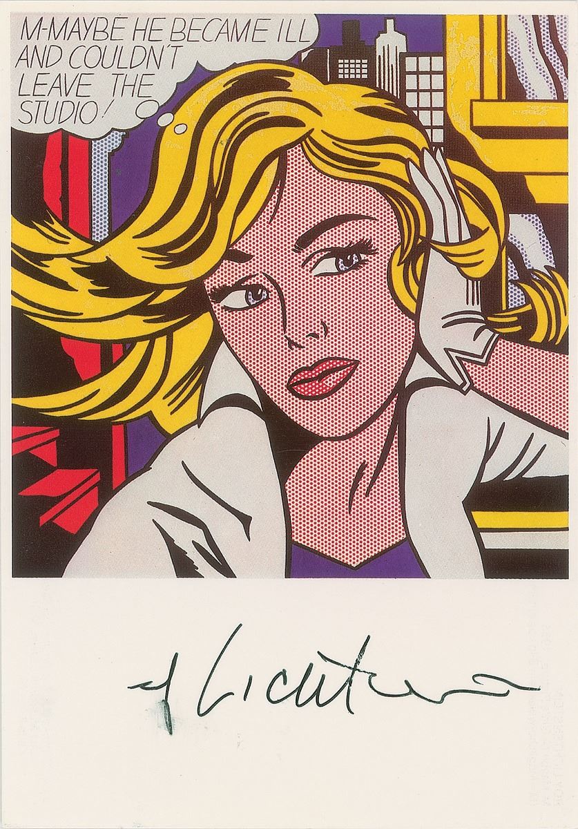 Color postcard depicting Lichtenstein's 1965 painting 'M-Maybe (A Girl´s Picture),' 4 x 5.75, signed in the lower border in black ink, "R. Lichtenstein." In fine condition, with a small smudge to the first name. Pre-certified PSA/DNA.