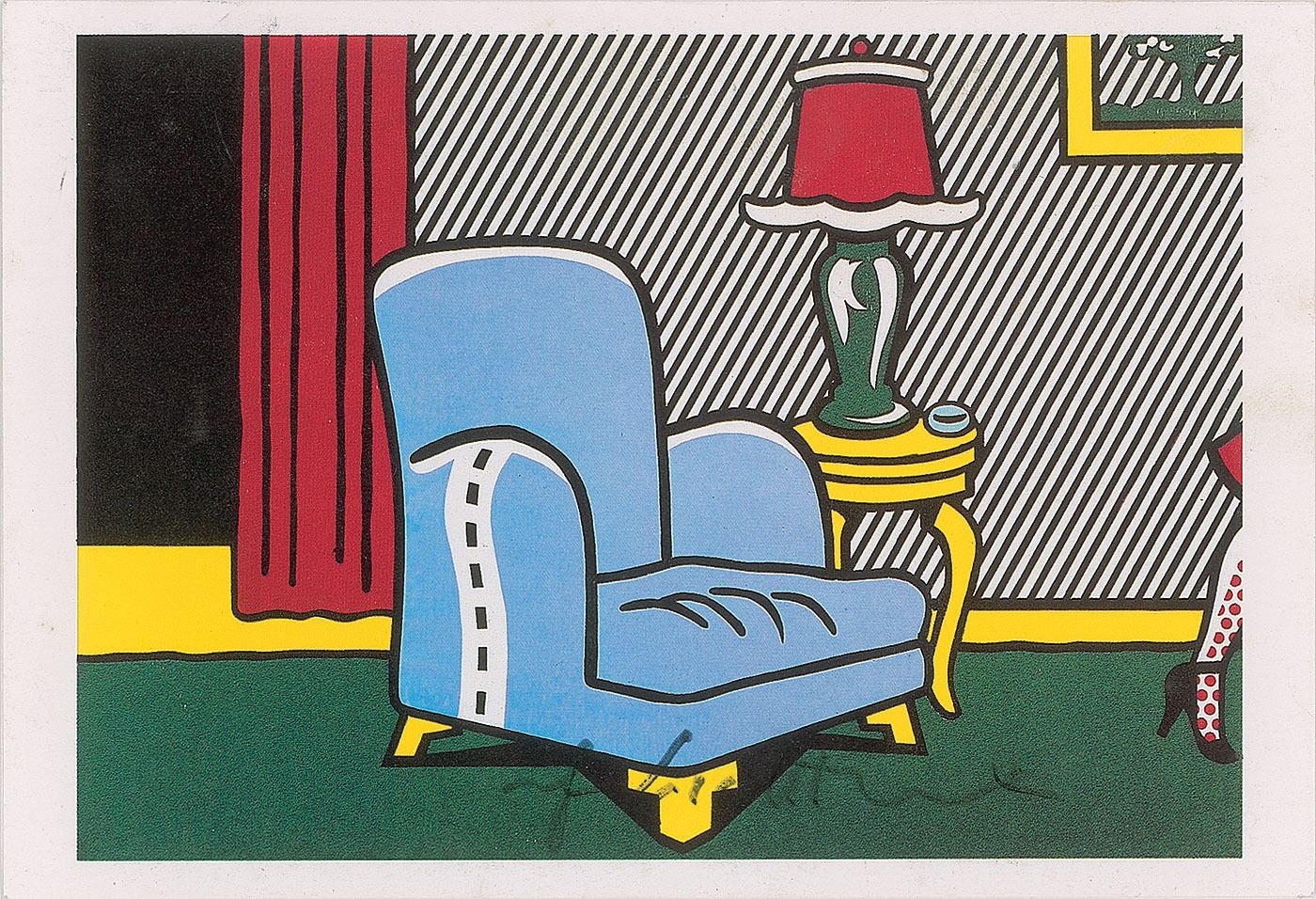 Attractive color 7 x 4.75 greeting card showing Lichtenstein's 1991 work La Sortie, signed on the front in black felt tip, "R. Lichtenstein." In fine condition, with light signature contrast.