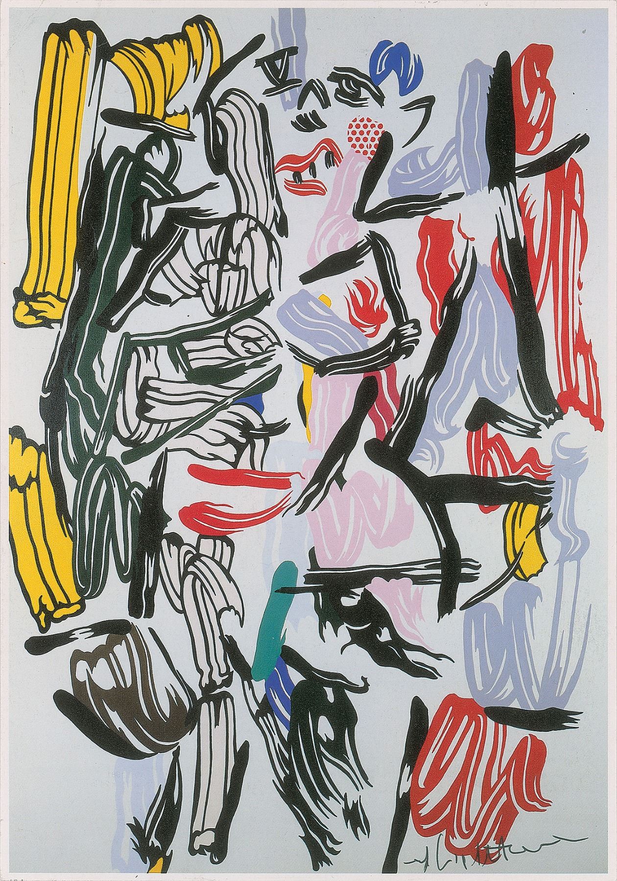 Color 7.25 x 10.5 print of one of Lichtenstein's abstract artworks removed from an exhibition catalog, signed in the lower right in black ink, "R. Lichtenstein." In fine condition.