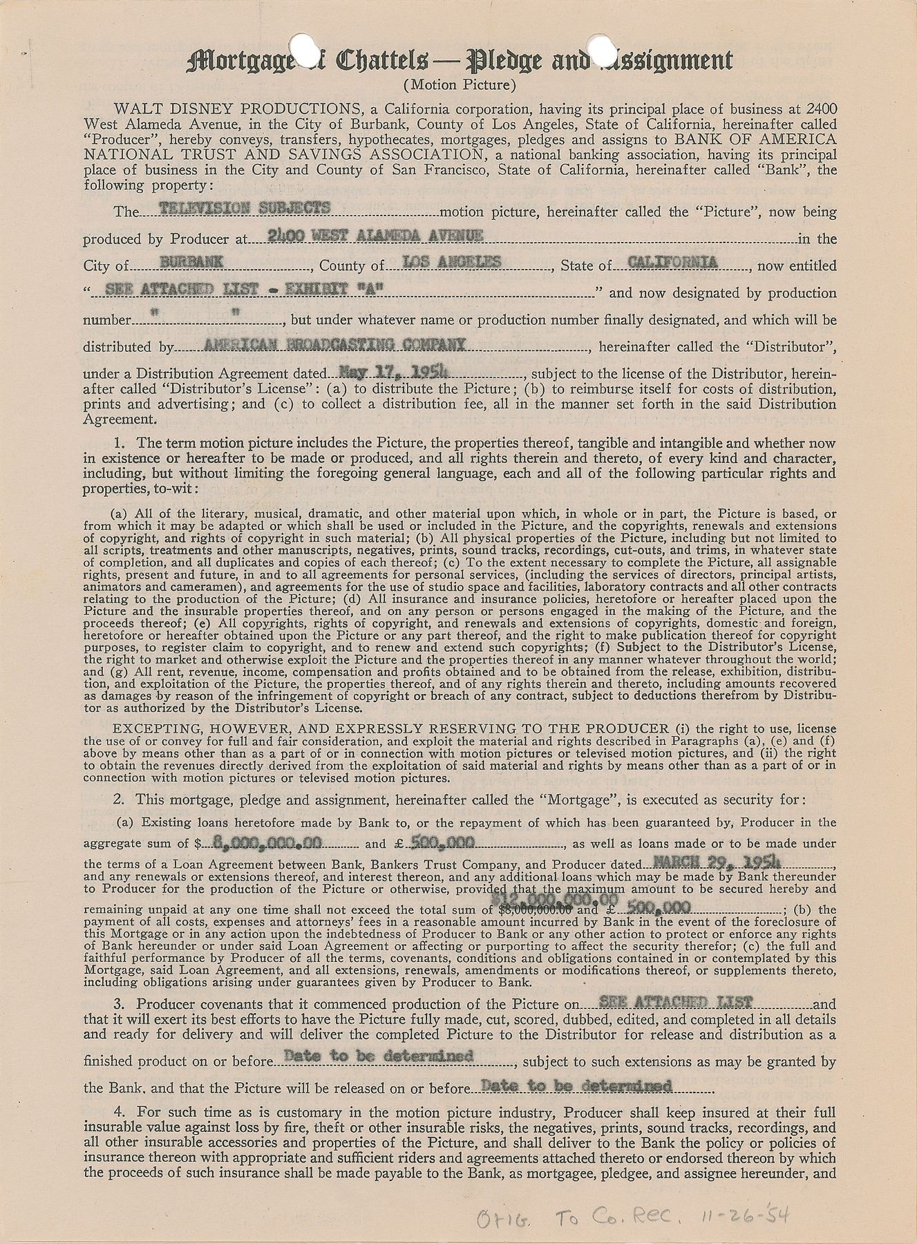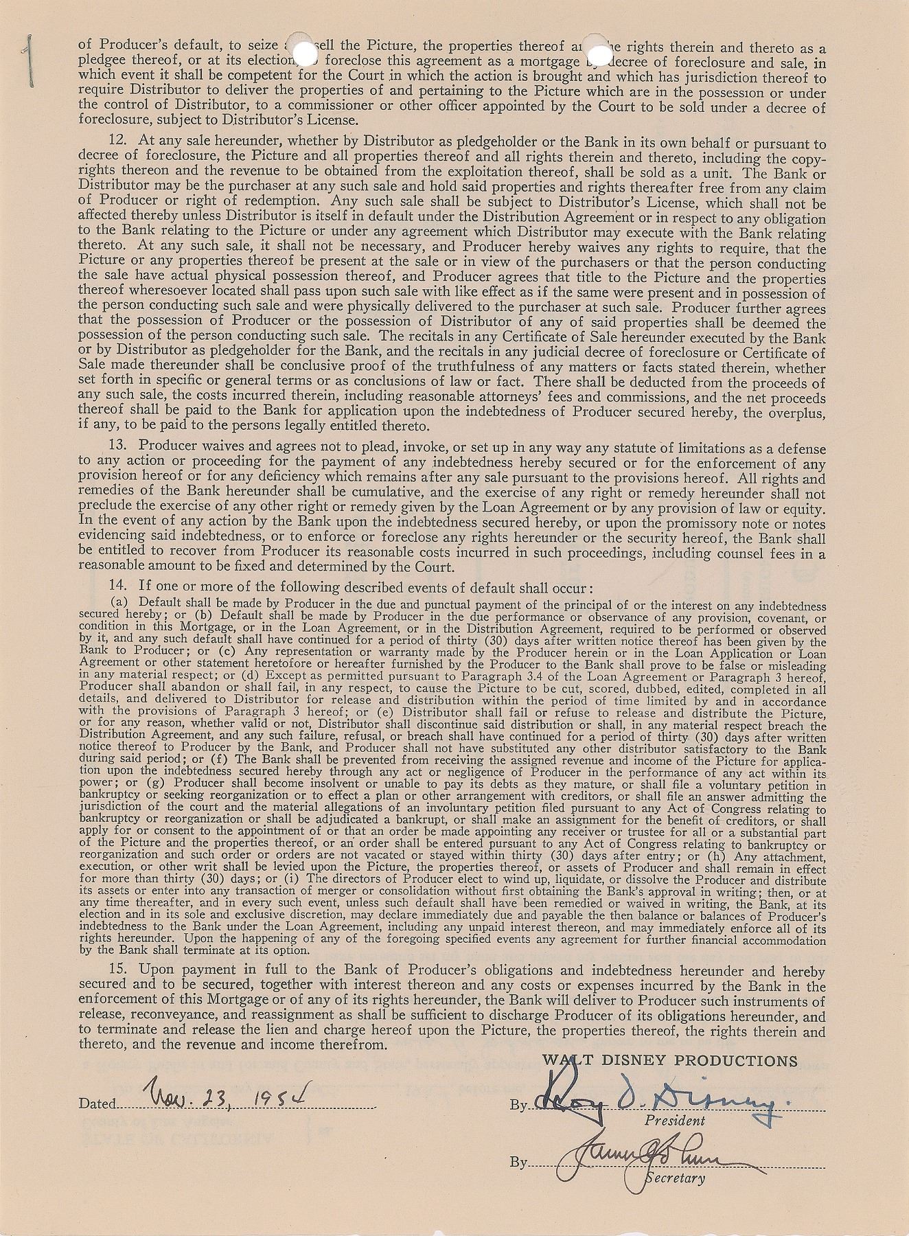 DS, four pages on two adjoining sheets, 8 x 11.5, November 23, 1954. Pledge and assignment of mortgage and chattels between Walt Disney Productions and the Bank of America for the television subjects named in "Exhibit 'A,'" the Fantasyland TV episodes "Operation Underseas" and "A Cowboy Needs a Horse." Signed at the conclusion of the third page in fountain pen by Disney. In fine condition. 'Operation Undersea' won Emmy Awards for Best Individual Program of the Year and Best Television Film Editing.