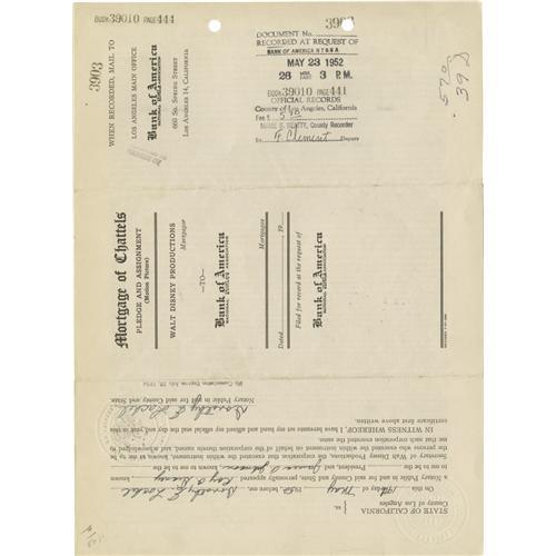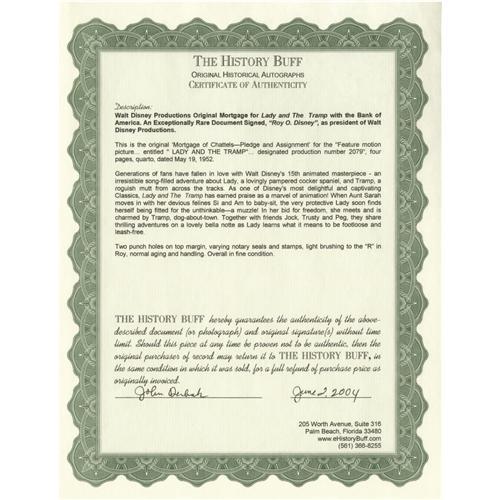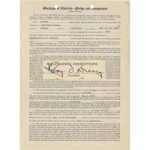 <B>Roy O. Disney Signed "Lady and the Tramp" Mortgage.</B></I> The original, four-page "Mortgage of Chattels -- Pledge and Assessment" for 1955 animated feature, dated May 19, 1952, and signed by Roy O. Disney as president of Walt Disney productions in black ink. In Very Fine condition with mild tanning, two horizontal fold creases, and the standard binder holes to the top edge. <I>Accompanied by LOA from PSA/DNA.</B></I><BR><BR><b>Shipping:</b> Flat Material, Small (<a target="_blank" href="http://www.heritageauctions.com/common/shipping.php">view shipping information</a>)