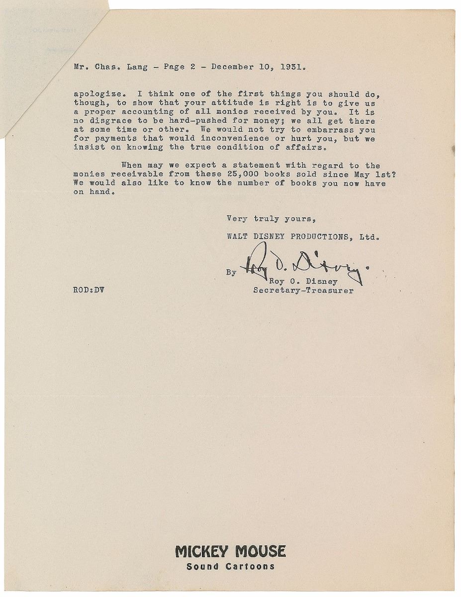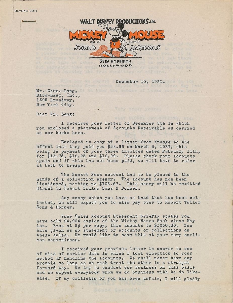 TLS signed “Roy O. Disney,” two pages, 8.5 x 11, nicely illustrated Mickey Mouse letterhead, December 10, 1931. Letter to Charles Lang, in part: “Your Sales Account Statement briefly states you have sold 24,994 copies of the Mickey Mouse Book since May 1st. Even at 5¢ per copy, this amounts to $1250.00. You have given us no statement of accounts or collections on these sales. We would like to have this at your very earliest convenience. I received your previous letter in answer to one of mine of earlier date in which I took exception to your method of handling the accounts. We shall never have any trouble so long as we treat the other in a straight forward way. We try to conduct business on this basis and we expect everybody whom we do business with to do likewise. If my criticism of you has been unfair, I will gladly apologize. I think one of the first things you should do, though, to show that your attitude is right is to give us a proper accounting of all monies received by you. It is no disgrace to be hard-pushed for money; we all get there at some time or other. We would not try to embarrass you for payments that would inconvenience or hurt you, but we insist on knowing the true condition of affairs. When may we expect a statement with regard to the monies receivable from these 25,000 books sold since May 1st? We would also like to know the number of books you now have on hand.” In fine condition. Bibo and Lang was a publisher who received one of the first licenses from Disney to use character images in its products, and published the first Disney book, simply titled The Mickey Mouse Book, in 1930. An insightful, aesthetically pleasing piece of correspondence dating to the infancy of the Mickey Mouse phenomenon.