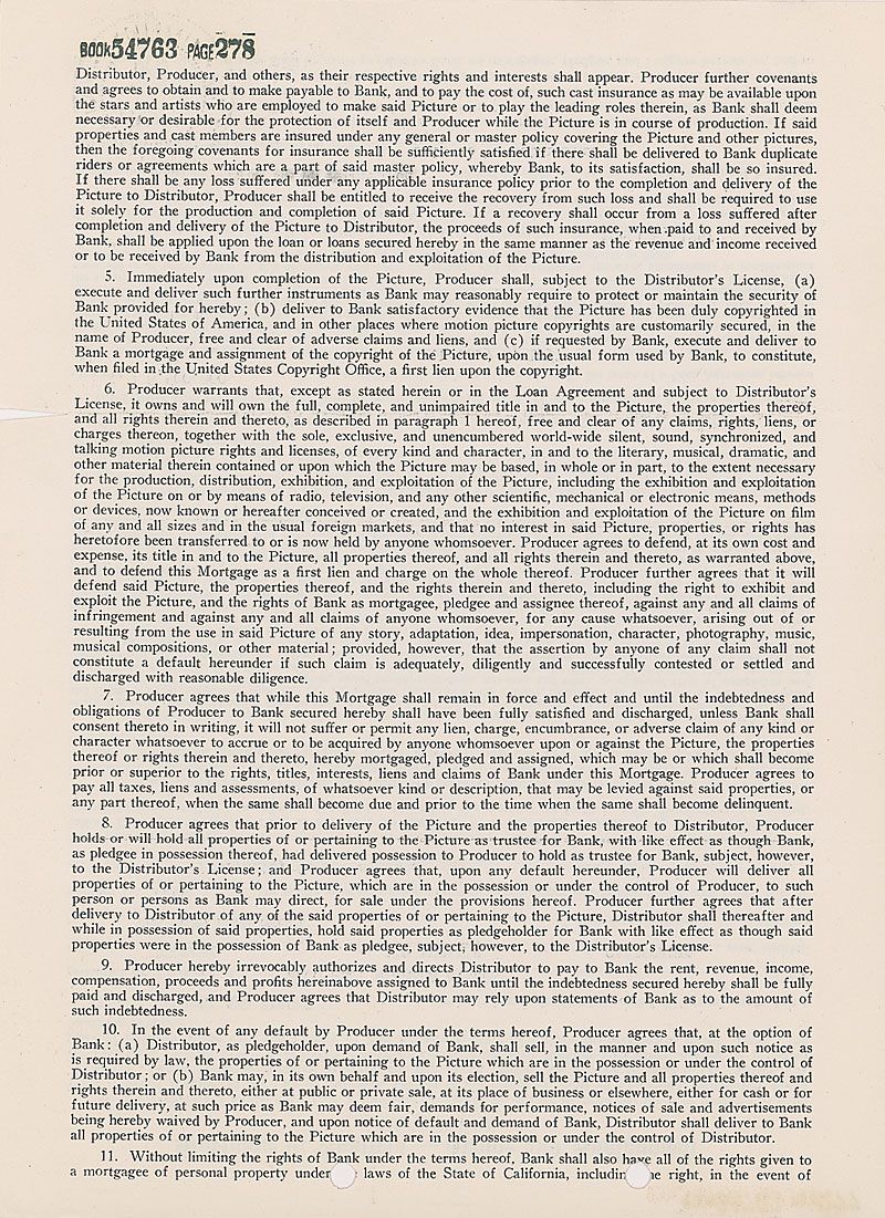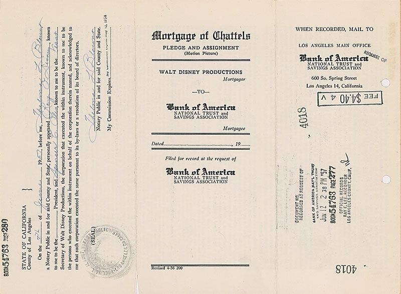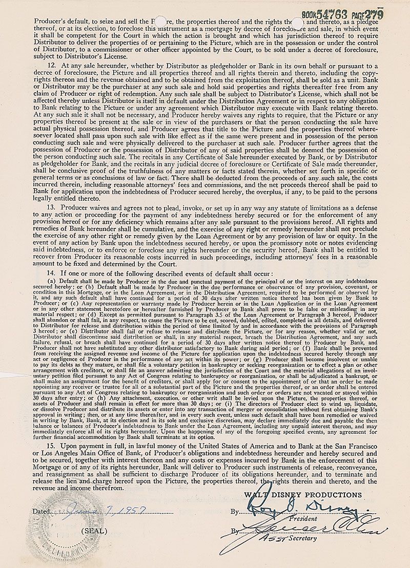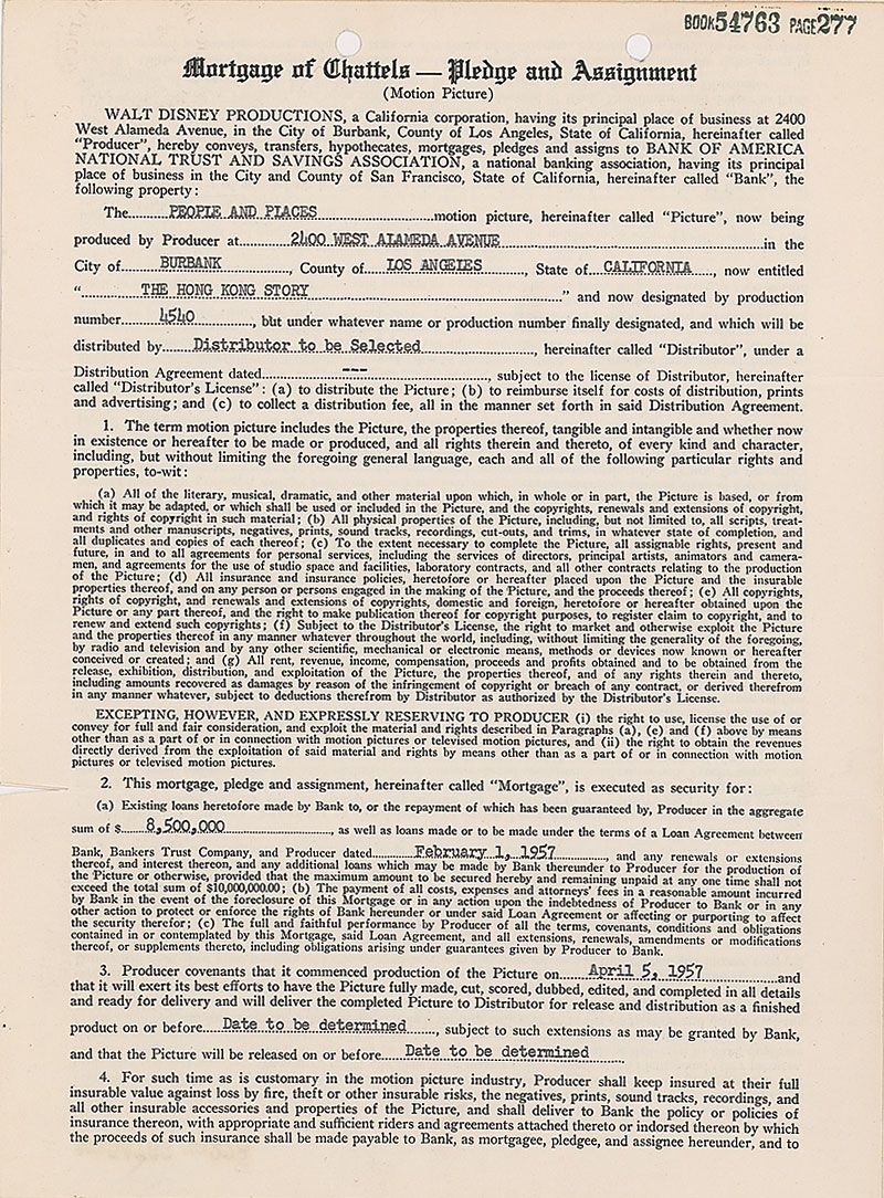 Walt’s brother and co-founder of the Walt Disney Company (1893–1971). Notarized DS, two pages both sides, 8.5 x 11, June 7, 1957. Pledge and assignment of mortgage and chattels between the Walt Disney Company and the Bank of America in regards to “the People and Places motion picture…now entitled ‘The Hong Kong Story,’” for a total of $8,500,000. Signed on the third page by Disney. In fine condition, with expected light document wear.