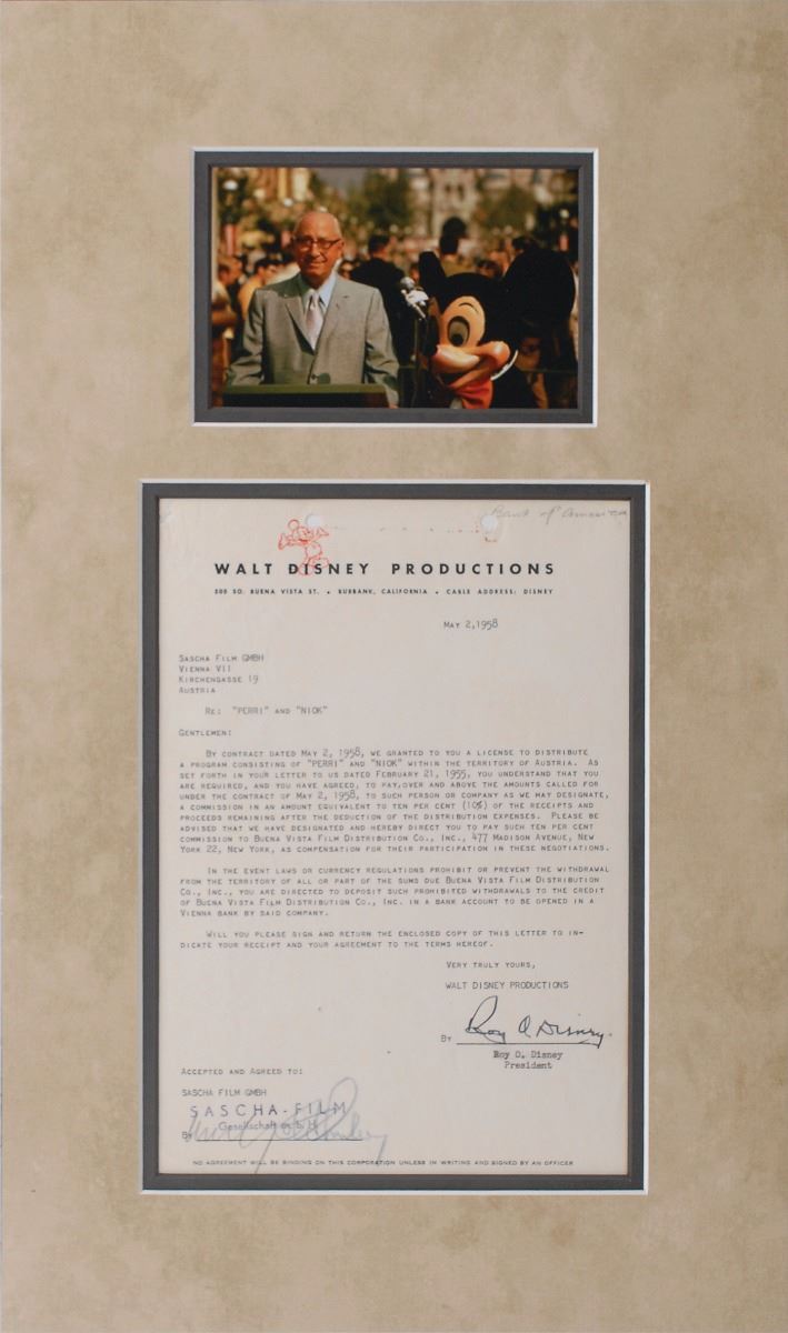DS, one page, 7.25 x 10.5, May 2, 1958. Walt Disney Productions document sent to the Sascha Film GmbH in Austria. In part: “We granted you a license to distribute a program consisting of ‘Perri’ and ‘Niok’ within the territory of Austria…and you have agreed, to pay…a commission in an amount equivalent to ten per cent (10%) of the receipts and proceeds.” Signed at the conclusion in fountain pen by Disney and countersigned in pencil by representatives of Sascha Film. Archivally double-matted with a color photo of Disney to an overall size of 12.25 x 21. In fine condition, with expected document wear. Accompanied by a certificate of authenticity from noted Disney expert Phil Sears.
