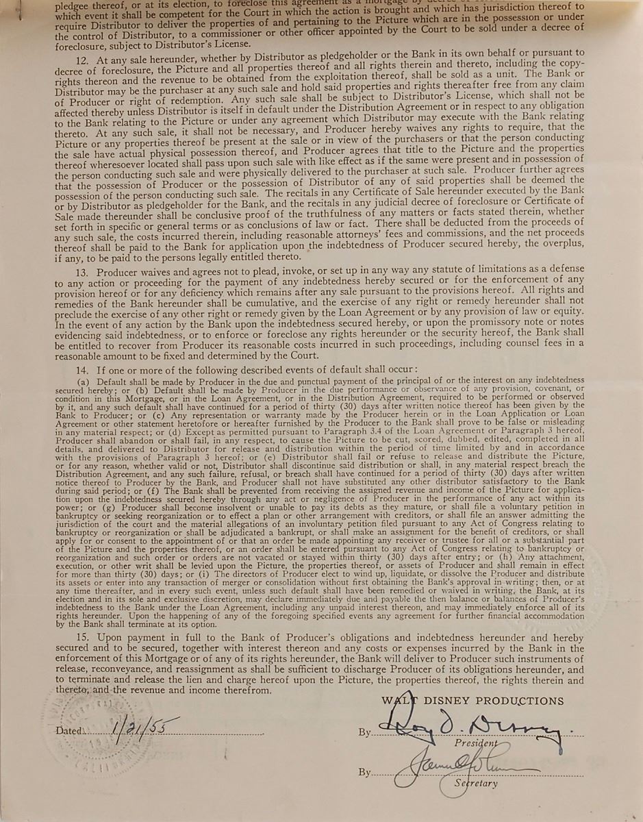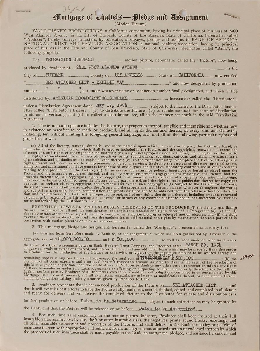 DS, two pages both sides, 8.5 x 11.5, May 17, 1954. Pledge and assignment of mortgage and chattels between the Walt Disney Company and the Bank of America in regards to “Exhibit A,” a list of television subjects which include “Fantasyland—Story of Fables,” “Adventureland—A Progress Report & Nature’s Half Acre,” “Fantasyland—Cavalcade of Songs,” and “Fantasyland—Wind in the Willows.” Stapled to the document is the aforesaid “Exhibit A.” Signed at the conclusion of the third page in fountain pen by Disney. In fine condition.