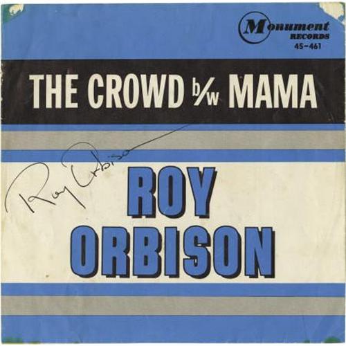 <B>Roy Orbison Autographed "The Crowd"/"Mama" 45 Record Sleeve.</B></I> "The Crowd" / "Mama" 45 record sleeve signed by the legendary Pop/Rock star on the front of the sleeve in black ink. In Very Fine condition with age toning to the sleeve.<BR><BR><b>Shipping:</b> Flat Material, Small (<a target="_blank" href="http://www.heritageauctions.com/common/shipping.php">view shipping information</a>)