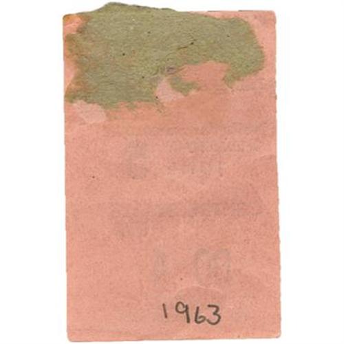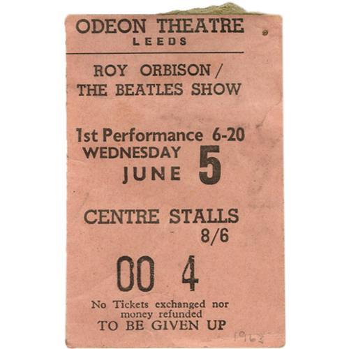 <B>Roy Orbison/Beatles Concert Ticket.</B></I> A used ticket for a June 5, 1963, performance at the Odeon Theatre in Leeds. At the time, Orbison was headlining a European tour with The Beatles, and became lifelong friends with the band, in particular with John Lennon and with George Harrison, with whom he would later record as part of the Traveling Wilburys. During the tour, Orbison encouraged The Beatles to come to the United States, and when they finally decided to do so, they asked Orbison to manage their first tour but his own schedule forced him to turn down the offer. Unlike many American artists, Orbison's style and substance, including one of Rock's greatest voices, allowed him to weather the impending musical storm known as the British Invasion. In Very Good condition with some edge wear and mild staining.