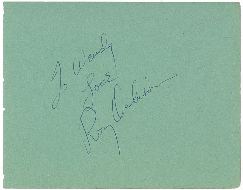 Vintage ballpoint signature, “To Wendy, Love, Roy Orbison,” on a green 5.5 x 4.25 album page. In fine condition. Accompanied by a full letter of authenticity from Roger Epperson/REAL.