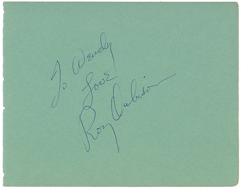 Vintage ballpoint signature, “To Wendy, Love, Roy Orbison,” on a green 5.5 x 4.25 album page. In fine condition. Accompanied by a full letter of authenticity from Roger Epperson/REAL.