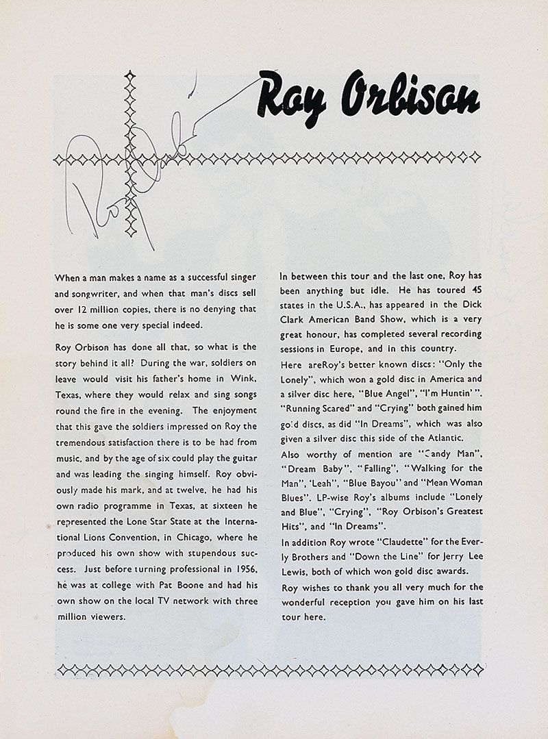 Vintage program page, 7.5 x 10.25, from Orbison’s tour with Freddie and the Dreamers, signed in black ballpoint by Orbison. Reverse features a photo of Freddie and the Dreamers, signed in blue ballpoint by Roy Crewdson. A central vertical fold, and some rippling and light dampstaining to lower right of page, otherwise fine condition.