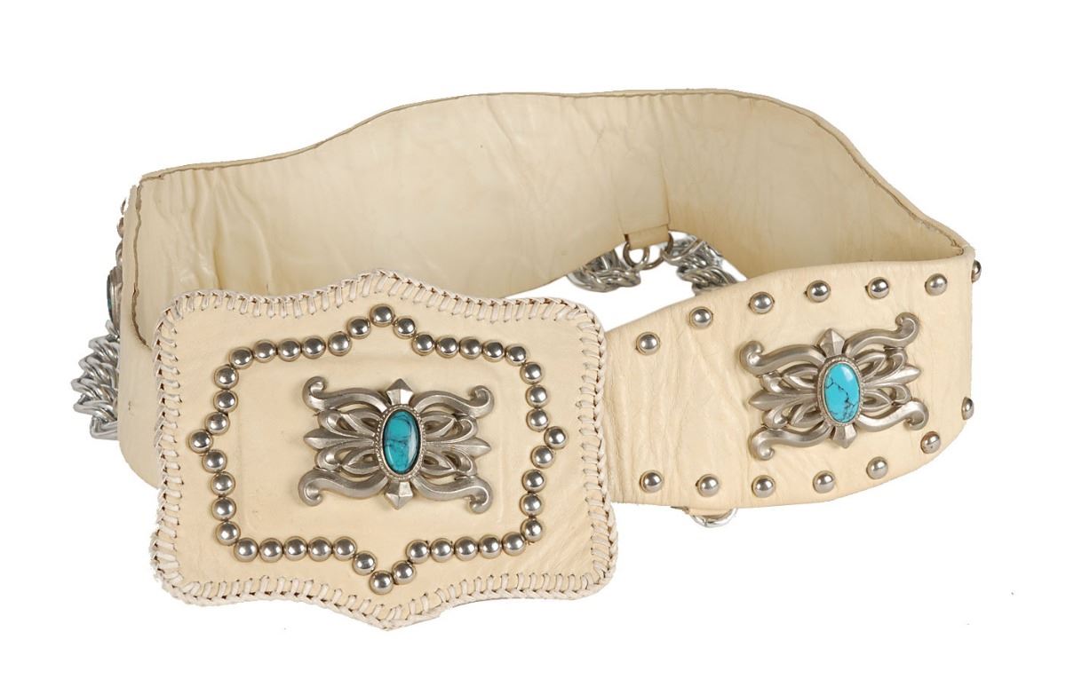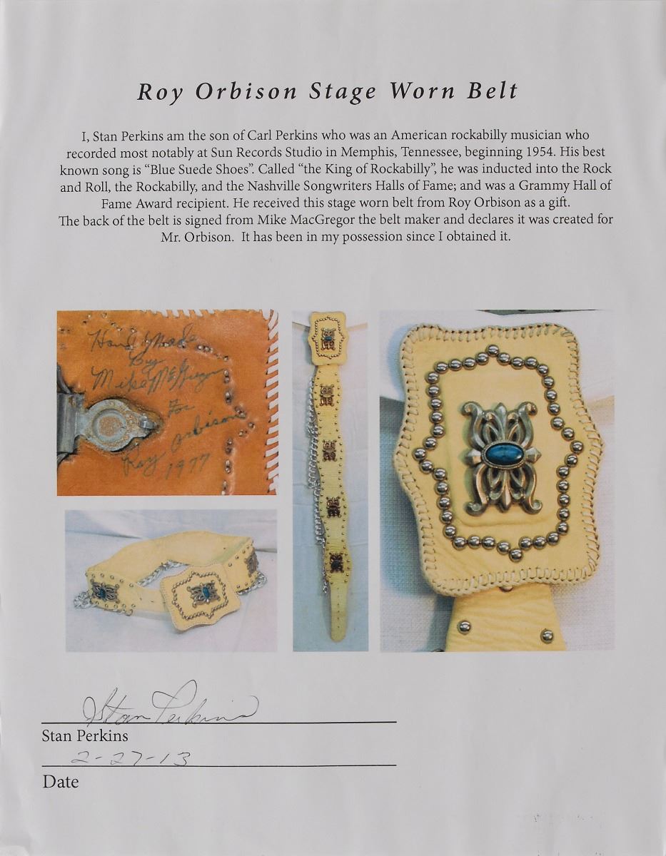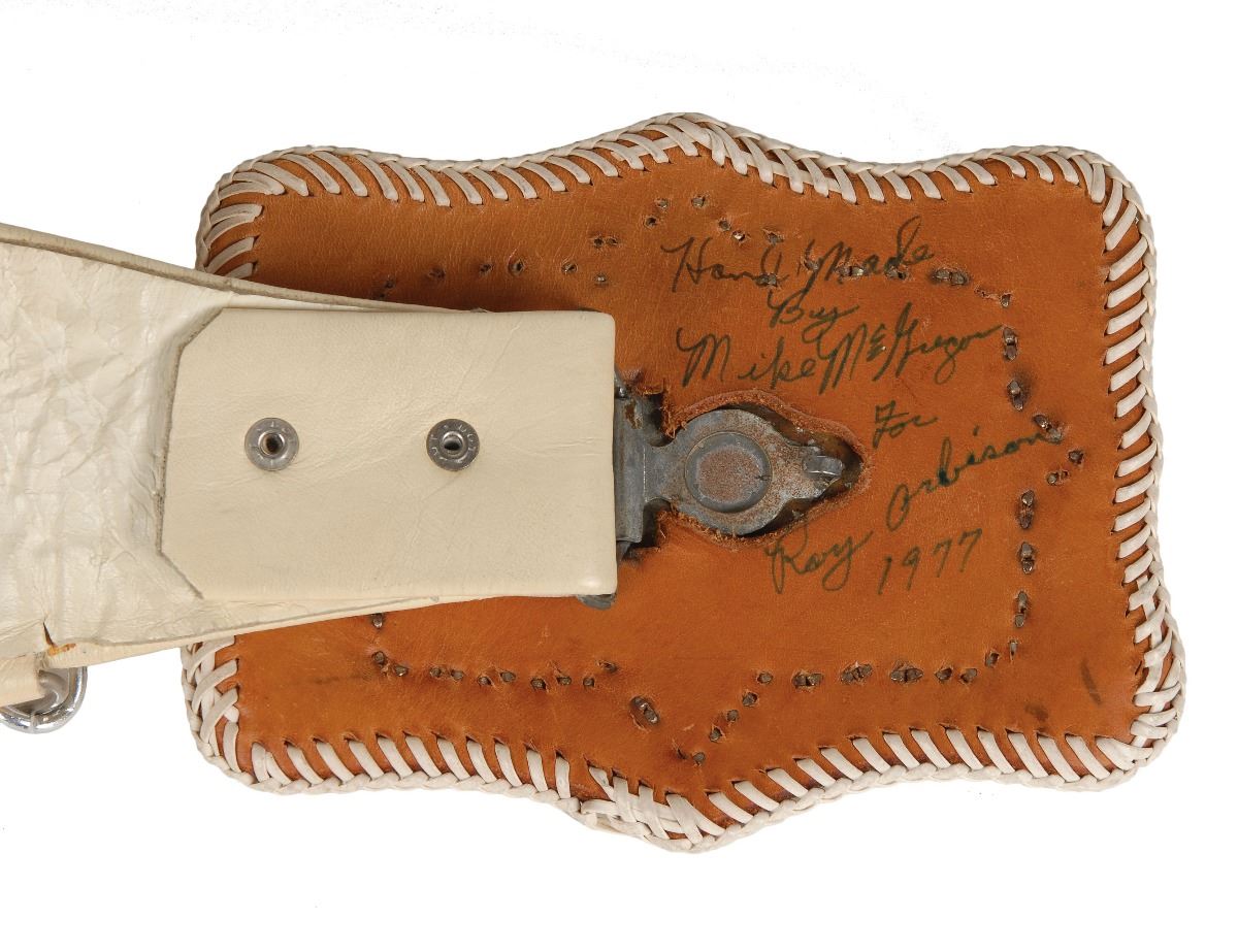Roy Orbison’s stage-worn white leather belt given as a gift to fellow musician Carl Perkins. The belt measures 45? long and 4? wide with a hanging chain along the bottom edge, and is adorned with metal and turquoise decorations. Signed inside the buckle by the maker, “Hand made by Mike McGregor for Roy Orbison, 1977.” Accompanied by a letter of provenance from Carl Perkins’s son Stan, stating that his father “received this stage worn belt from Roy Orbison as a gift.”