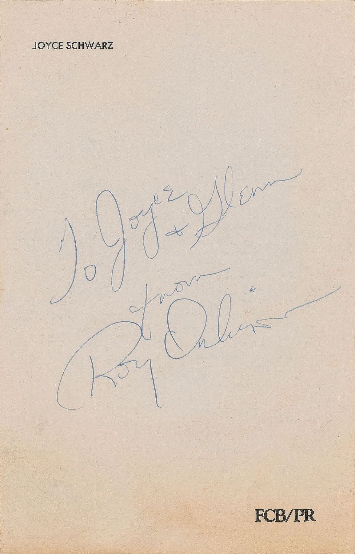 Ballpoint signature and inscription, "To Joyce & Glenn, from Roy Orbison,” on an off-white 5.5 x 8.5 sheet of letterhead belonging to the recipient. In fine condition.