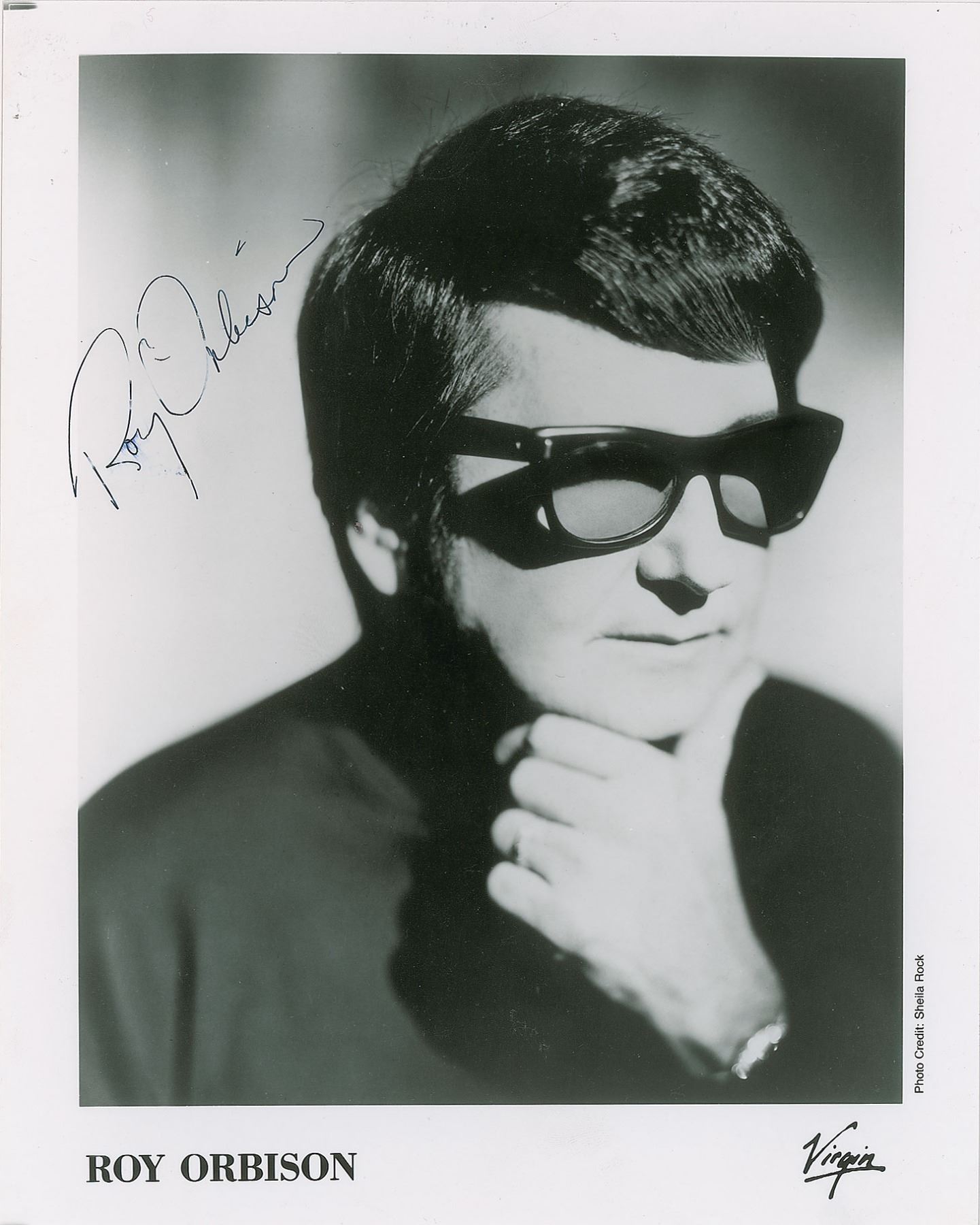 Semi-glossy 8 x 10 Virgin Records publicity photo of Roy Orbison, signed in black ink. In very good to fine condition, with a few light surface creases, a heavier crease to the top center, and light brushing to the signature.