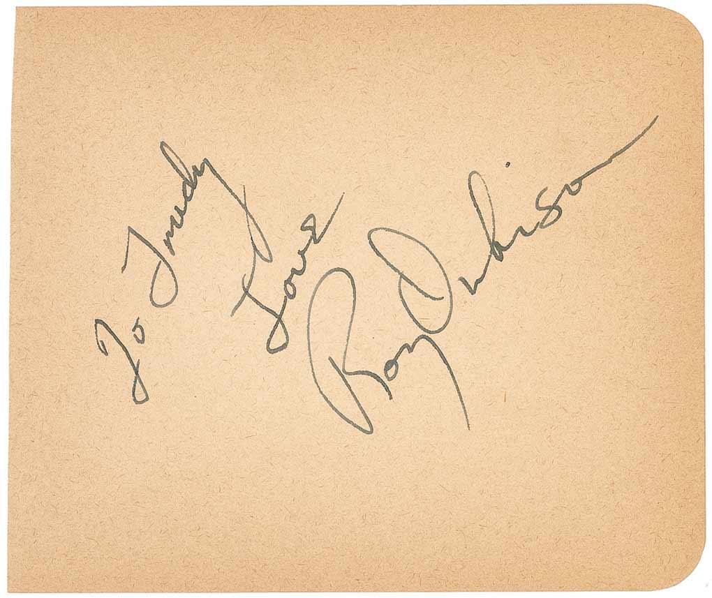 Singer/songwriter/guitarist who died of a heart attack at the age of 52 in 1988. Vintage fountain pen signature and inscription, “To Trudy, Love, Roy Orbison,” on an off-white 5.25 x 4.5 album page. In fine condition, with uniform toning, not detracting from the bold signature.