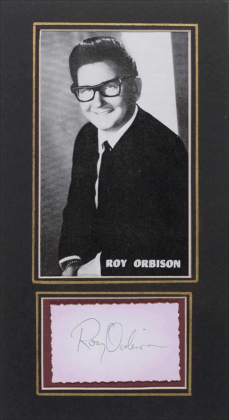 Ink signature, “Roy Orbison,” on a light purple 3.75 x 2.25 deckle-edge slip. Matted with a photo of a young Orbison, to an overall size of 6.75 x 12. In fine condition. Pre-certified Roger Epperson/REAL and RRAuction COA.