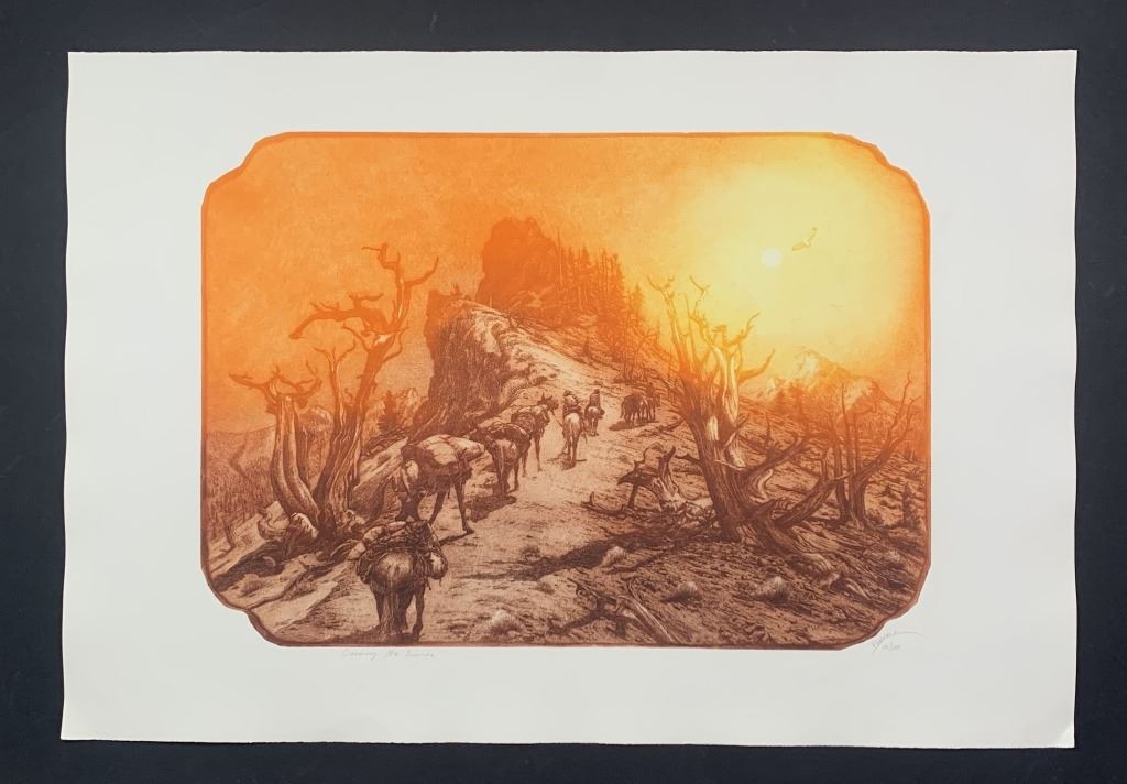 Roy Purcell's "Crossing the Divide" limited edition print, signed and numbered 136/250 lower right, and titled lower left. This piece is of men on horseback going up a trail, attempting to 'cross the divide', with the sun setting off in the distance. This piece is in near excellent condition with a minor crease lower right corner, and an extremely minor crease lower left corner.